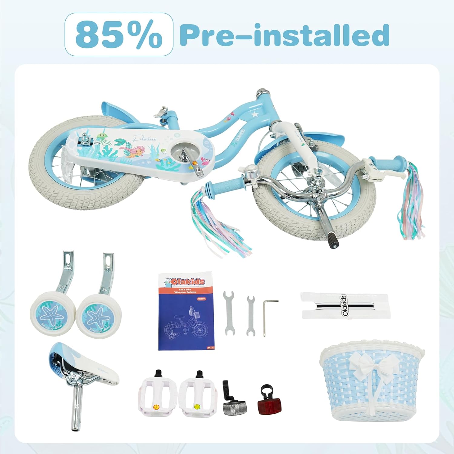 Description: Introducing OLAKIDS mermaid-themed bicycle for kids specially crafted for your little princess! Adorned with dreamy mermaid accents and flowing streamers that dance in the wind, every detail is designed to capture her heart at first sight. The adorable front basket perfectly blends cuteness with functionality, making it a delightful addition to the ride. More than just a pretty look, this toddler bike with training wheels grows right alongside your children. Suitable for kids over 3 years old. Safety is our top priority too. Built to last with a high-quality carbon steel frame, this girl bikes offers unbeatable sturdiness and support for all kinds of adventures. The 18’’ and 20’’ bike is equipped with kickstands to meet parking needs. To make things even easier, this bike arrives 85% pre-assembled, allowing for quick and hassle-free setup that saves parents precious time and effort.
