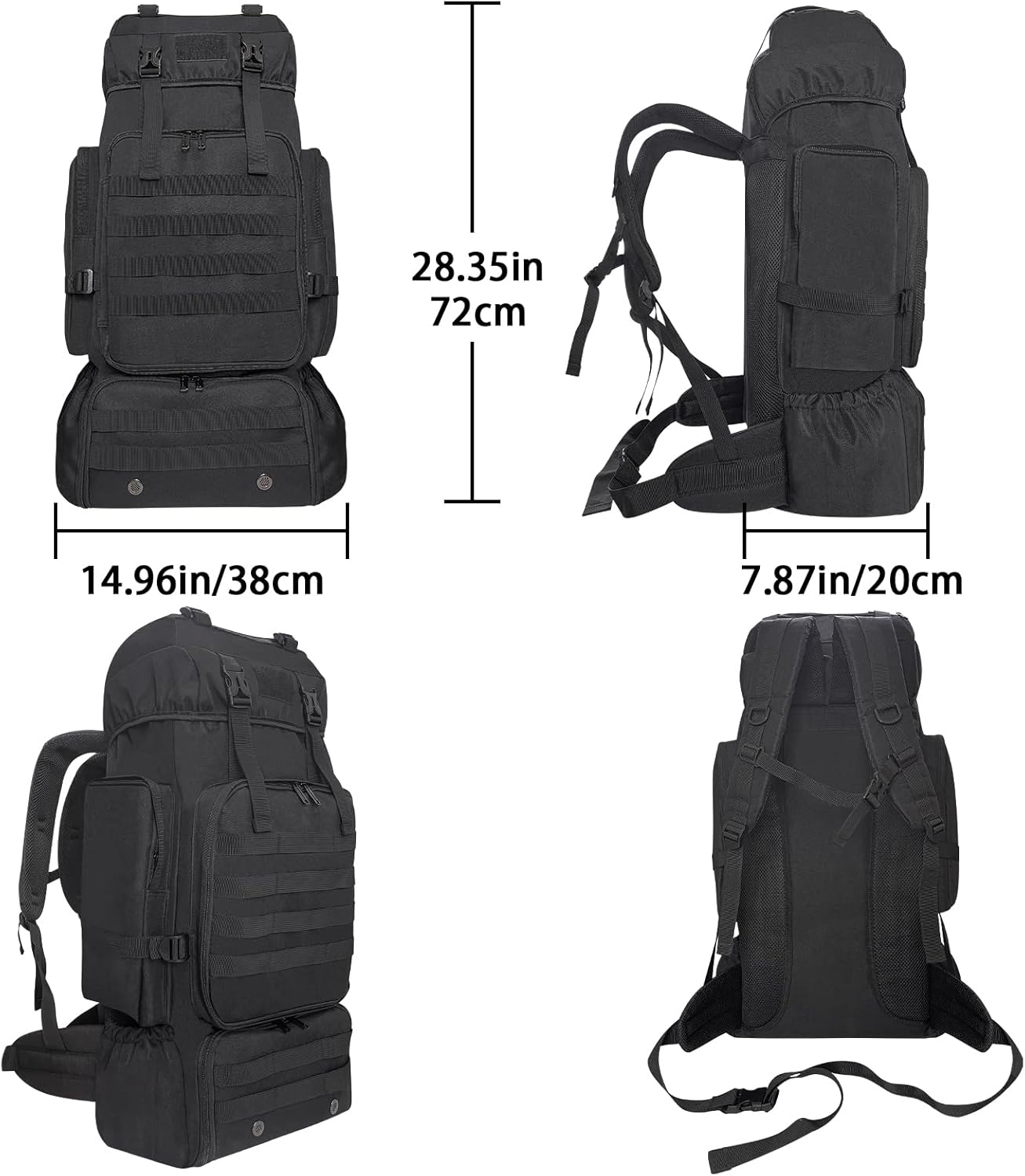Large Hiking Backpack Men for Camping and Outdoors Closing Drawstring Design Special main pocket closing drawstring design, tight closure to prevent the items falling from the backpack. Waterproof Rain CoverOur backpack rain cover is made of high-quality 210t TAFFETA mixed material, which effectively keeps your backpack and belongings dry even in heavy rain.More Stitching At Stress Points Military backpack for men tactical with excellent tearing resistance, the camping bag is stronger and not easy to tear. Breathable Shoulder Straps This hiking backpack men's back pad is filled with soft mesh material. Wider, thicker S-shaped shoulder straps and highly elastic breathable back support provide optimal ventilation and lighten your load. Separate Shoe Warehouse Shoes separated storing pouch, preventing the items inside backpack to be dirty, convenient and practical. MOLLE Backpack Make it available to hang other molle bag like water bottle, pouch, and gear, well organized and meet your need in different situation. Multipurpose Camping Backpack Tactical Backpacks can contain all your travel everyday items. You can use it in many activities. Such as hiking, traveling, camping, climbing, and fishing.