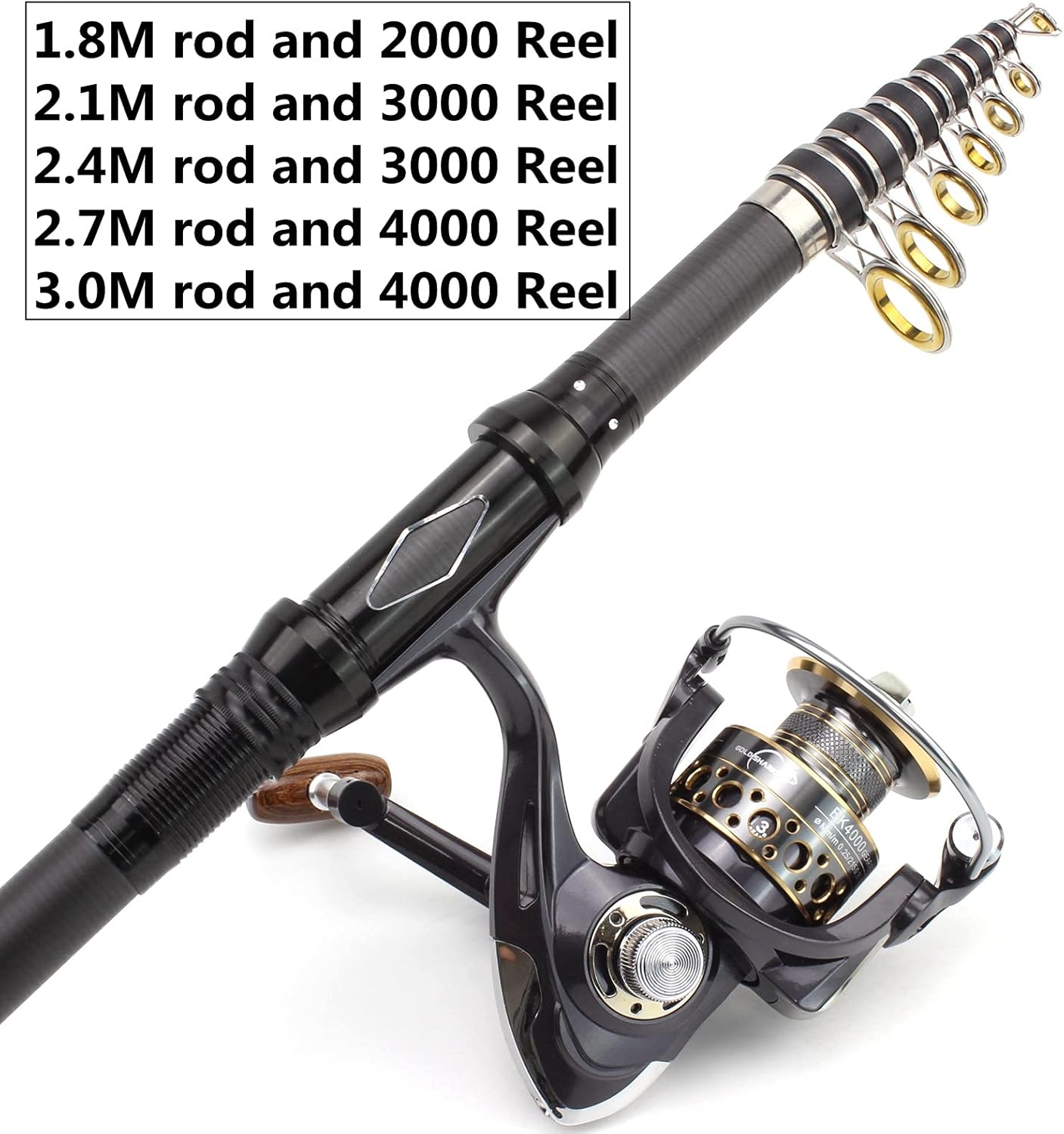 Product Manual:1. The shrinkage size of the new rotating telescopic bait fishing rod is 44-53cm, and the extension size is 1.8m, 2.1m, 2.4m, 2.7m, 3.0m. It can be put in a backpack and is very convenient to carry.2. Throw the bait stick on the shore, the bait weighs 30 to 60 grams.3.13BB fishing reel, stainless steel material, sturdy and durable.4. The telescopic fishing rod and spinning wheel suit have 5 lengths for you to choose:Product details:Product details introduction:1.8M Rod+2000 Reel---- Length: 171cm | Closed length: 44cm | Section: 5 | Weight: 98g | Lure weight: 30-60g | Top diameter: 1.7mm2.1M Rod+3000 Reel---- Length: 204cm | Closed length: 46cm | Section: 6 | Weight: 136g | Lure weight: 30-60g | Top diameter: 1.7mm2.4M Rod+3000 Reel---- Length: 236cm | Closed length: 48cm | Section: 7 | Weight: 175g | Lure weight: 30-60g | Top diameter: 1.7mm2.7M Rod+4000 Reel---- Length: 275cm | Closed length: 49cm | Section: 8 | Weight: 224g | Lure weight: 30-60g | Top diameter: 1.7mm3.0M Rod+4000 Reel---- Length: 300cm | Closed length: 53cm | Section: 8 | Weight: 241g | Lure weight: 30-60g | Top diameter: 1.7mmProduct advantages:2021 new fishing rodUltra-short design, easy to carry,High-carbon pole body, very strong.The quality is reliable, please rest assured to buy,I wish you a happy fishing!