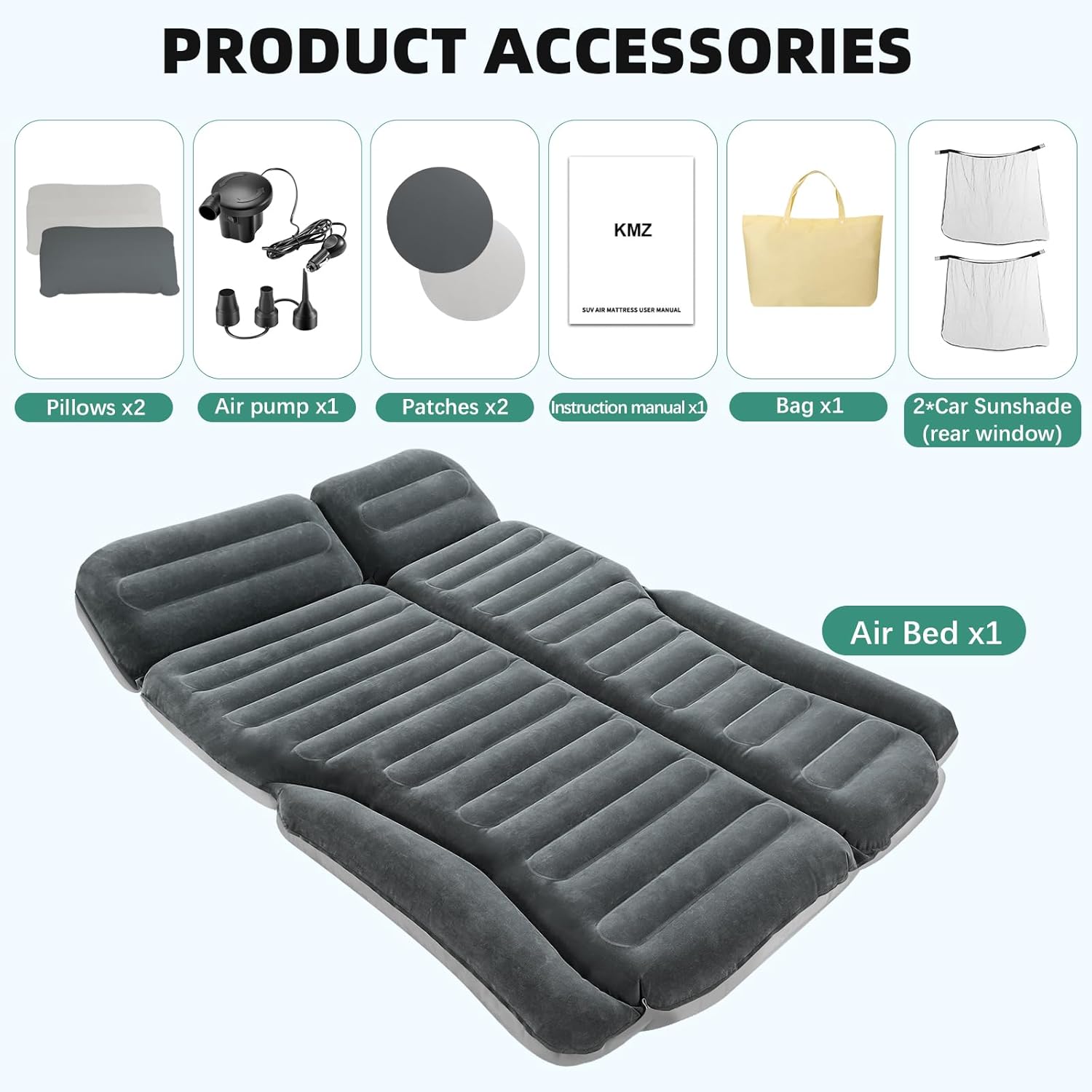 | Included Components | 1 x SUV Air Mattress, 2 x Pillows, 1 x Air Pump, 1 x Carry Bag, 1 x Instruction Manual, 2 x Repair Patches |