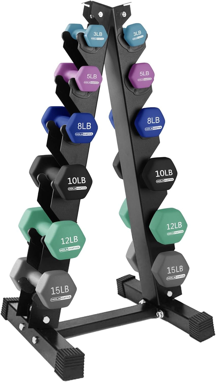 Take your exercise routine to the next level! Challenge yourself with the HolaHatha Neoprene Hand Dumbell Set. You have everything you need to introduce weight training into your routine. These weights are great for yoga, walking, running, physical therapy, or simple lifting exercises. This collection builds, tones, and defines your muscles each and every workout. With a neoprene cover stretched over cast iron, these durable weights can handle indoor or outdoor activities. Thanks to the non-slip material, this equipment stays in your hand, and the hexagonal shape of the dumbbells means they won't roll away when not in use. This training set also comes with a handy storage rack, and the weights have easily distinguishable colors to help you keep your home gym or studio clean and organized. Adding these dumbbells to your exercise routine is a step towards a stronger, healthier, and more confident you. The HolaHatha Neoprene Hand Dumbell Set will help you reach your fitness goals.