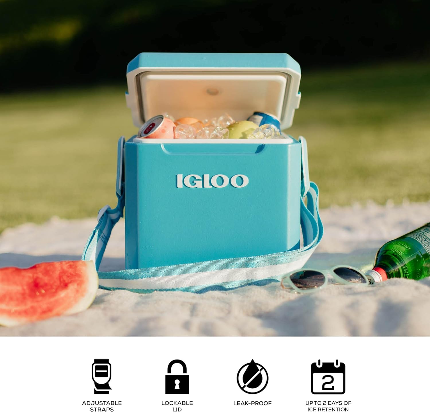 For the laidback times and those nonstop days, Tag Along Too will keep you on the bright side of cool. With this spacious yet compact cooler, we put a modern twist on an Igloo classic. Designed with more style and ease than ever, this cube cooler comes in a rainbow of fun colors and features a stylishly woven adjustable strap for hands-free crossbody carrying. Product Details Left Spacious yet compact 11-quart size Extra-long, adjustable woven shoulder strap for easy, hands-free carrying over a shoulder or as a crossbody Lid locks at each side & features an interior gasket seal to prevent spills & leaking MaxCold insulation in the body & lid provides advanced ice retention Plenty of vertical space to hold sports drinks & bottles upright Robust piano-style knuckle hinge with detent feature keeps the lid open until you shut it closed Put the size into perspective: Holds 14 cans Item #: 00032657 Care Instructions Left Wipe interior and exterior surfaces clean before storing and between uses. To prevent stains and odors, empty cooler of contents after use. Light dirt or stains can be cleaned with water or mild detergent. Tougher stains may be cleaned with diluted solution of baking soda and water. Ensure all cleaning agents are thoroughly rinsed and the cooler is dry before storage. Capacity:14 12-oz cans11 quarts (10 liters) Weight:5.26 lbs2.39 kgs Exterior Dimensions ( L x W x H ):13.07" x 9.33" x 13.07"33.19cm x 23.69cm x 33.19cm