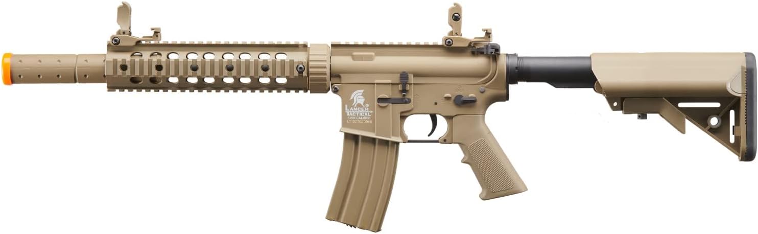 OverviewThis durable M4 fires using a nylon polymer rifle, maintaining a powerful, lightweight build while maneuvering throughout the field. This keeps your rifle internals safe during use, maintaining integrity indoor and outdoor. The installed free-float modular rail interface system enables the user to switch between rails, fully customizing their rifle to your the loadout they prefer on a whim..The precision 6.03mm tightbore diameter of your inner barrel provides better airsoft accuracy at higher speeds. The Lancer M4 AEG full-metal version 2 gearbox and 8mm bushings ensure your BBs line up correctly, taking less stress on your internals. At stock, this rifle fires at a muzzle velocity of up to 390 FPS (Feet Per Second) but can be adjusted using a different spring thanks to the quick change spring system.