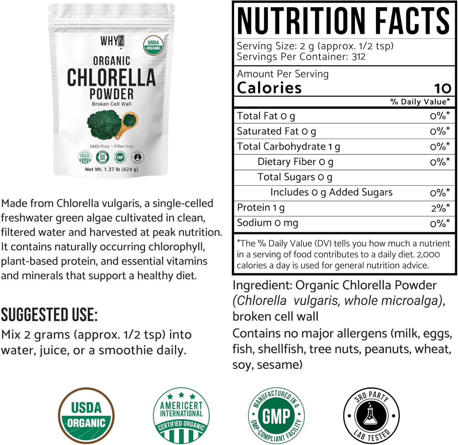 | Title | Organic Chlorella Powder, Raw, Premium Superfood Rich in Vegan Protein & Chlorophyll, Non-GMO, Vegan-Friendly Supplement, 312 Servings, 1.37 lb (624g) |