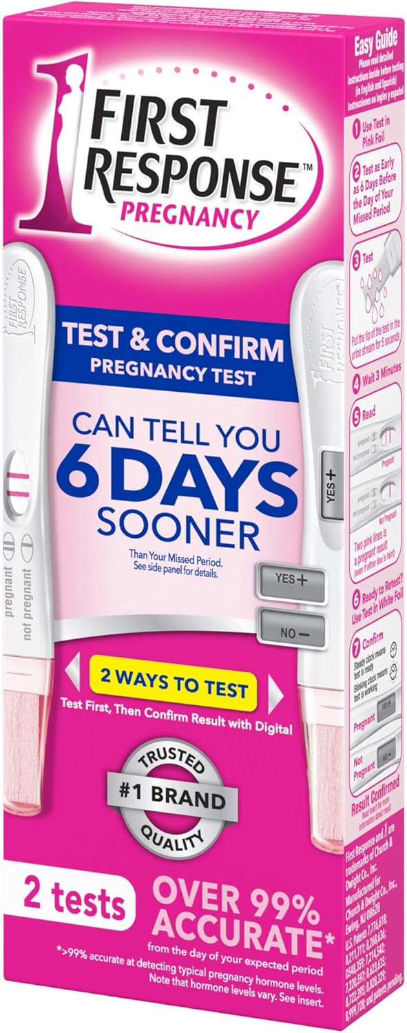 Be sure, with two unique tests in one pack! Sensitive enough to capture scant amounts of the pregnancy hormone, First Response Early Result and First Response Digital pregnancy tests give you results 6 days sooner than your missed period.[1] No other leading brand can do that! First Response Early Result Pregnancy Test is over 99% accurate from the day of your expected period [2]. And it has an easy-to-read result – Two lines mean pregnant and one line means not pregnant. Result appears in 3 minutes. First Response Digital Pregnancy Test is over 99% accurate from the day of the expected period [2]. With First-to-Detect technology, it has an easy-to-read "YES+ / NO-" result and a unique "test is working" indicator that lets you know the test is ready for use. Result in just 3 minutes. [1] FIRST RESPONSE detects the pregnancy hormone 6 days sooner than the day of your missed period (5 days before the day of expected period). [2] >99% accurate at detecting typical pregnancy hormone levels from the day of your expected period. Note that hormone levels vary. See insert. [3] Nielsen AOC Diagnostics Database as of 4.28.18.