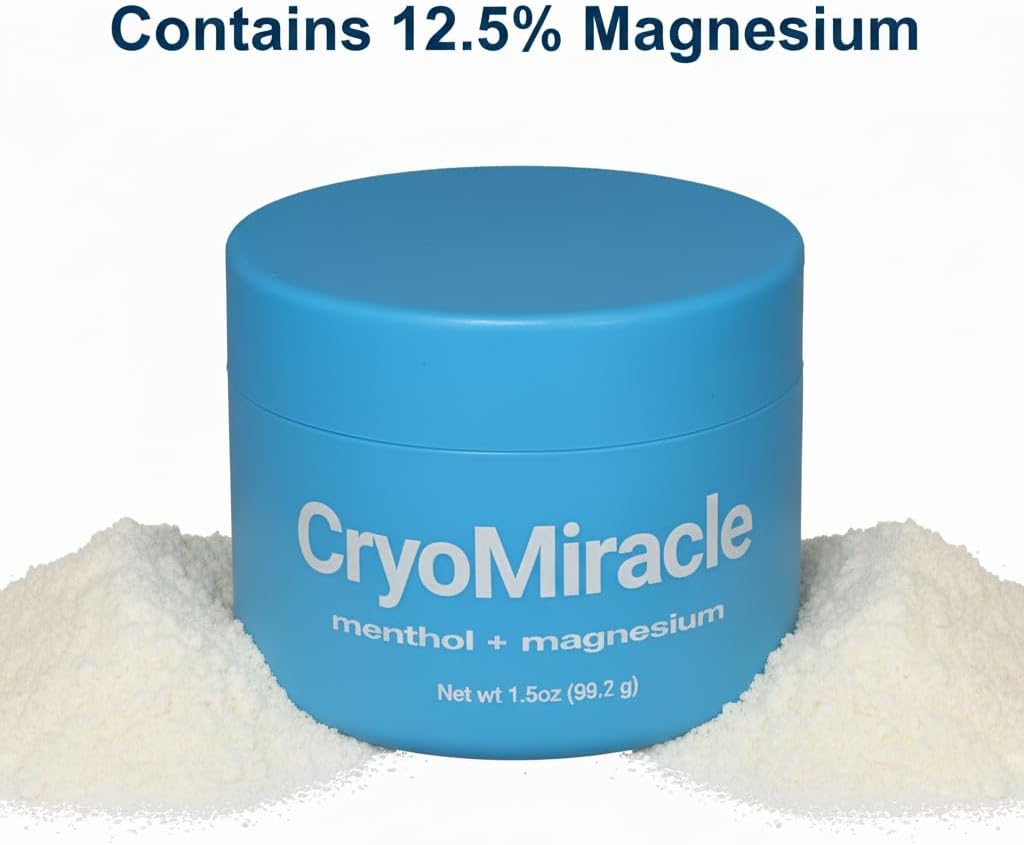 CryoMiracle is vegetarian and Cruelty Free to give you the piece of mind that you are receiving the purest and most natural ingredients on the market today. Each 3.5 oz jar of buttery soft cream contains 10% menthol + 12.5% magnesium and includes a spatula for application. The addition of magnesium to our unique formula sets us apart from the competition. Used widely in sports medicine, magnesium is an essential supplement found in the body. CryoMiracle is formulated for both customers who prefer a mild cooling sensation and those who prefer a more intense cooling sensation. To embrace the maximum cooling sensation, simply apply to clean moist skin. Those who prefer a mild cooling should apply to clean dry skin. Additional Ingredients: Purified water, Cetearyl Olivate (and) Sorbitan Olivate, Olive Oil, Peppermint essential oil, Beeswax, Lavender essential oil, Cetearyl Alcohol, Glyceryl Stearate, Caprylyl Glycol, Sorbic Acid Directions: For external use only. Product is intended only for adults and children 12 years of age and older. Apply a thin layer to skin using included spatula or latex glove. Wash hands with cool water after use. Warnings: Do not use if pregnant or breastfeeding. Keep out of reach of children. If swallowed, get medical attention or contact the Poison Control Center. Do not use with heating pad or wrap tightly. Store product at 20-25°C (68-77°F) and away from direct sunlight.