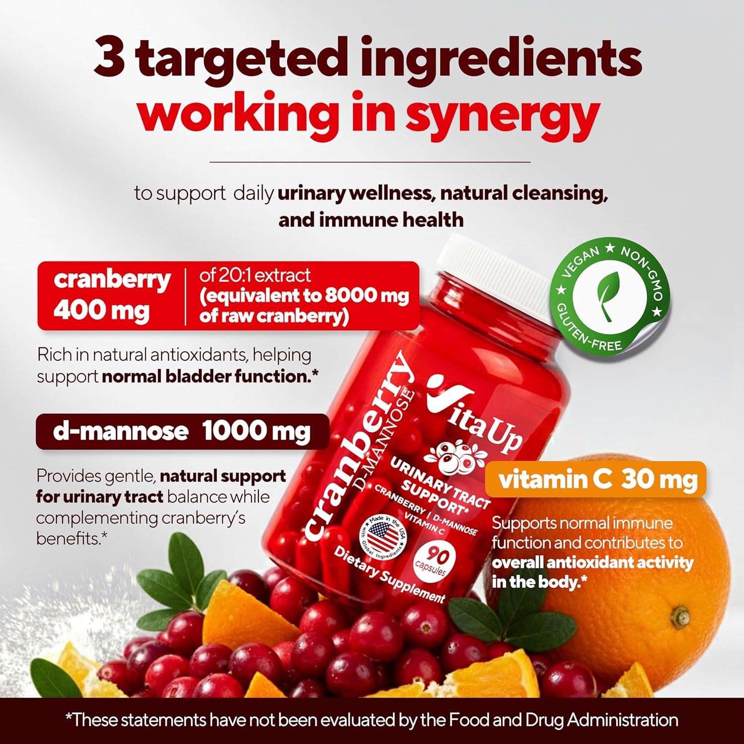 | Key Product Features | ADVANCED FORMULA: Unlock the benefits of our expertly crafted blend of D Mannose with cranberry extract, and Vitamin C. VitaUp D-mannose supplements for women are designed to support urinary tract and immune function —helping you stay balanced and confident every day.*, BLADDER SUPPORT: Made with natural cranberry concentrate, known for its antioxidant properties, VitaUp D-mannose 1000mg capsules contain natural antioxidants, supporting normal bladder function.*, GMP CERTIFIED: Manufactured in an FDA-registered facility, VitaUp cranberry supplements meet all required GMP standards. Each batch of our cranberry D-Mannose pills for women undergoes third-party lab testing for purity and potency. We do not use any GMOs, gluten, preservatives, or sweeteners.*, IMMUNE SUPPORT: Our powerful cranberry and D-mannose supplement is enriched with Vitamin C, which is known to support immune function and contribute to antioxidant activity in the body.*, URINARY TRACT SUPPORT: More than standard cranberry pills for women, VitaUp urinary tract supplement combines D-Mannose and cranberry extract for comprehensive support.* Our cranberry extract capsules are crafted to promote urinary tract health for women.* |
