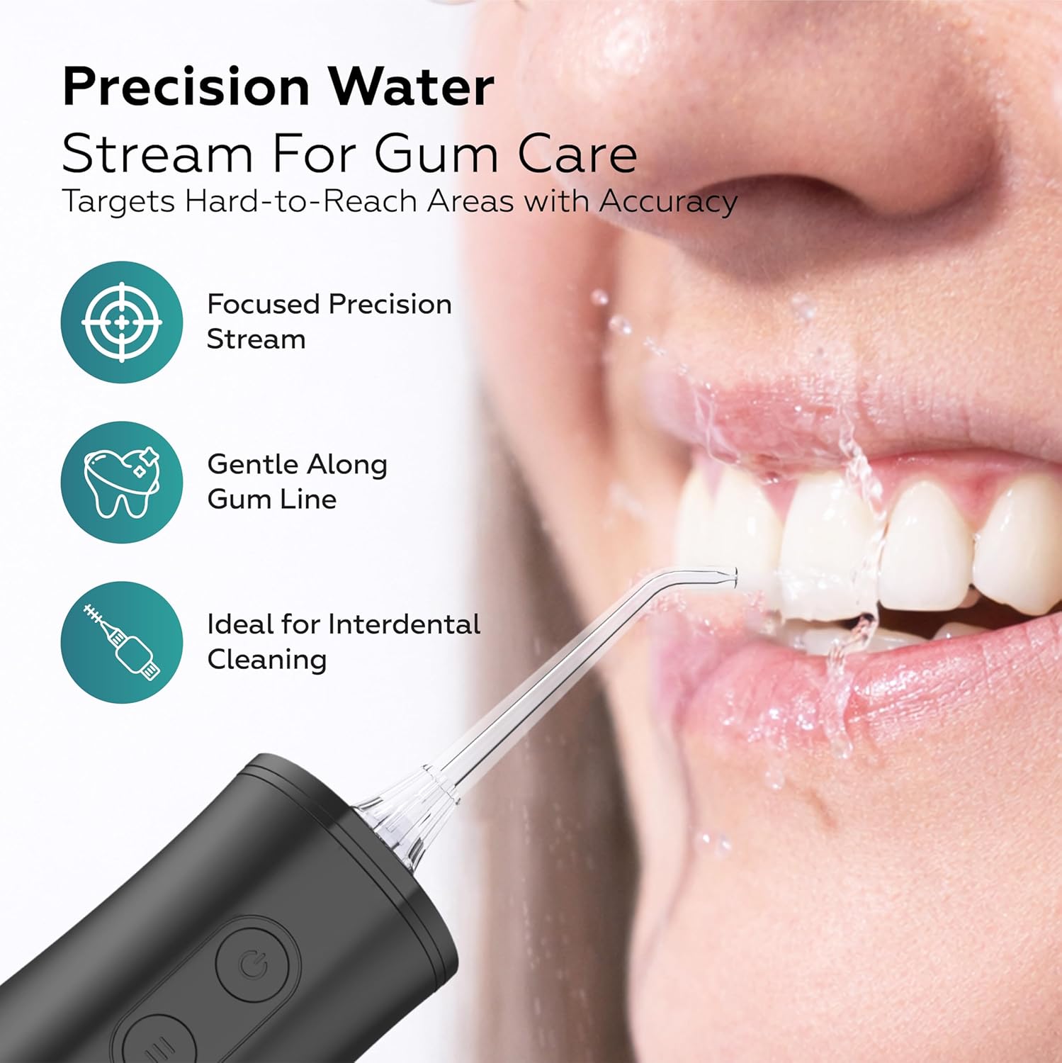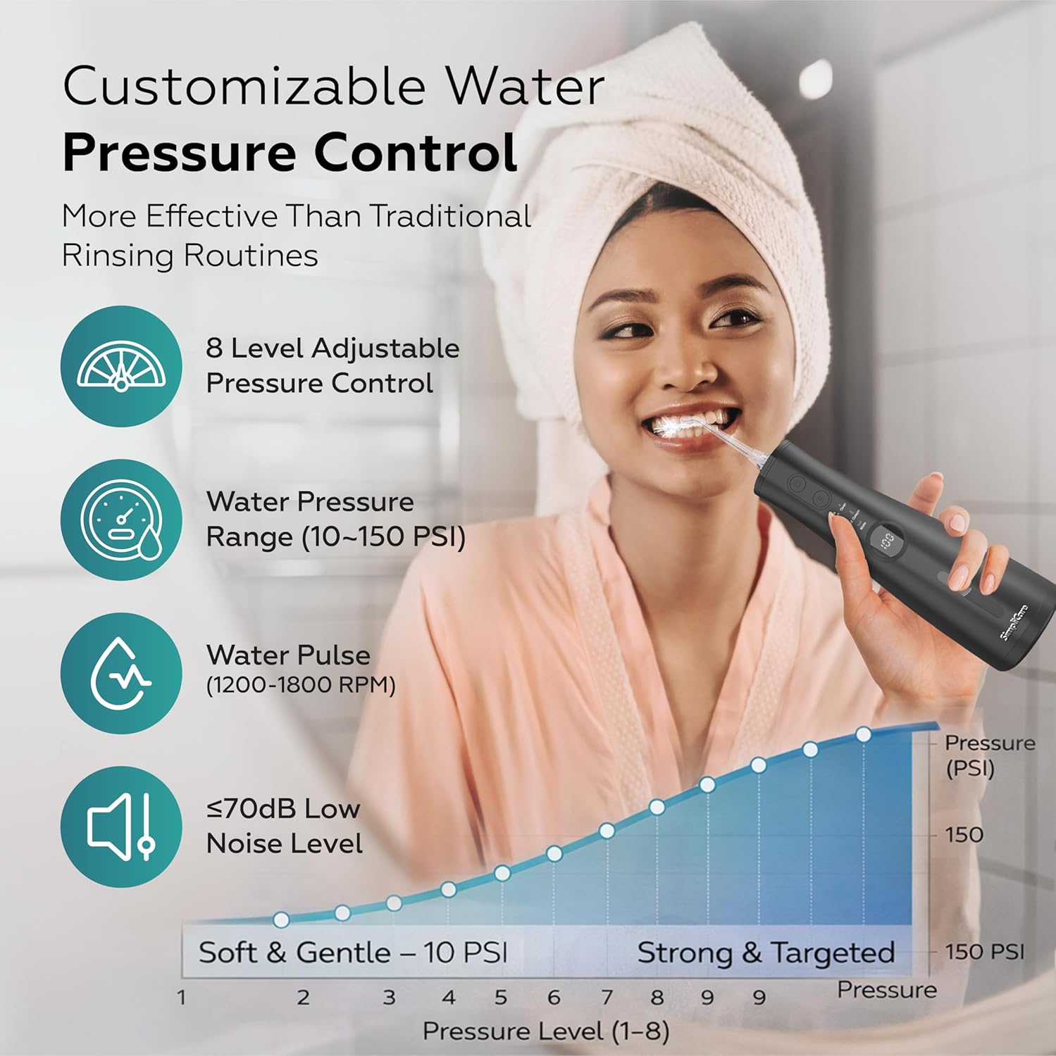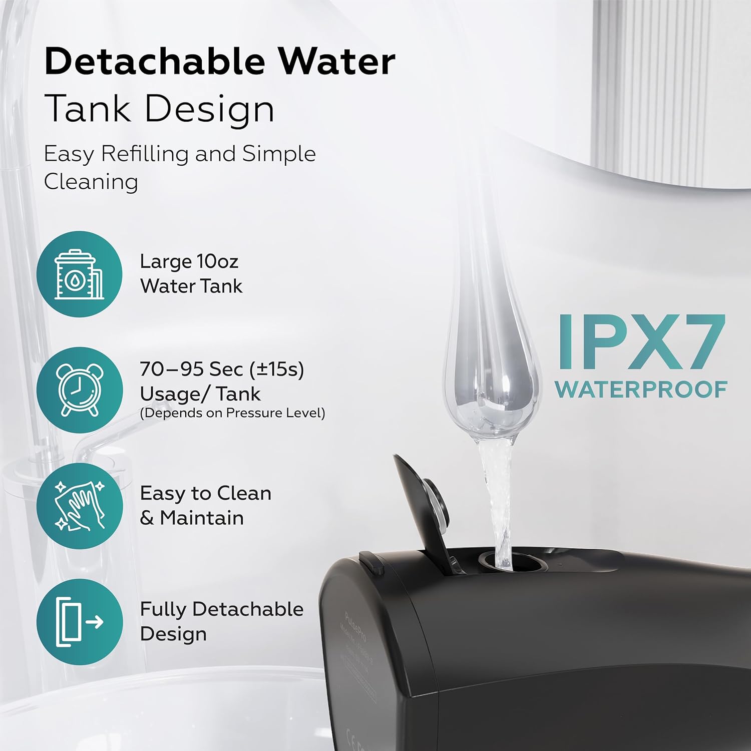 | Additional Features | 10–150 PSI Adjustable Pressure, 10 oz. Extra Large Water Tank, 1200–1800 Pulses/Min, 2,500mAh Long-Life Battery, Full Charge in Under 5 Hours - which lasts upto 30+ days., 5 Cleaning Modes, 8 Interchangeable Jet Tips- Water Dental Flosser, USB C-Rechargeable, IPX7 Showerproof, Cordless |