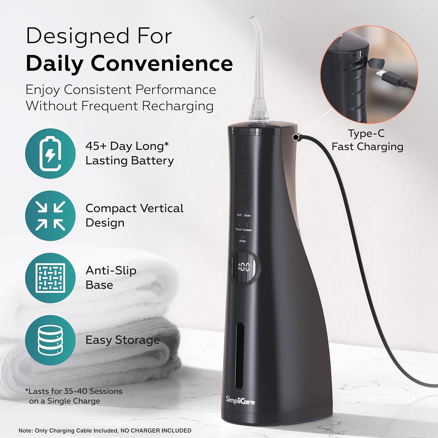 Upgrade Your Daily Flossing Routine with the SimpliCare F5039 Cordless Water Flosser String floss reaches the surface. The SimpliCare F5039 goes deeper. Powered by a high-frequency plunger pump (1,200–1,800 pulses/min) and a wide 10–150 PSI pressure range across 5 cleaning modes, this cordless oral irrigator delivers a targeted, pulsating water stream that clears food debris and plaque buildup from between teeth, along the gumline, and in hard-to-reach pockets that traditional flossing can't effectively address. Designed for Every Mouth, Every Need Whether you have braces, implants, crowns, sensitive gums, or are simply building a stronger daily routine, the F5039 adapts to you. The orthodontic and periodontal tips make it especially effective for those in orthodontic treatment or with gum concerns, while the standard jet tips and tongue cleaner round out a complete 8-tip oral care kit in one box. Built for Daily Use at Home or on the Go The 10 oz. (300ml) BPA-free water tank supports a full cleaning session without refilling. The cordless, lightweight design pairs with a 2,500mAh lithium-ion battery that holds dozens of charges between plug-ins—and USB-C charging means one cable does it all. IPX7 waterproof construction lets you use and rinse it in the shower without worry, and the ≤70 dB quiet operation means no disruptive motor noise at any hour. What’s in the Box 1 × SimpliCare F5039 Cordless Water Flosser (Main Unit) 5 × Standard Jet Tips 1 × Orthodontic Tip 1 × Periodontal Tip 1 × Tongue Cleaner Tip 1 × USB Type-C Charging Cable 1 × User Manual Weight Details Net weight (device only): 357 g (0.79 lb) Advanced Oral Care, Anywhere You Go, Quiet, compact, and built to last, SimpliCare is your partner for healthy smiles every day.