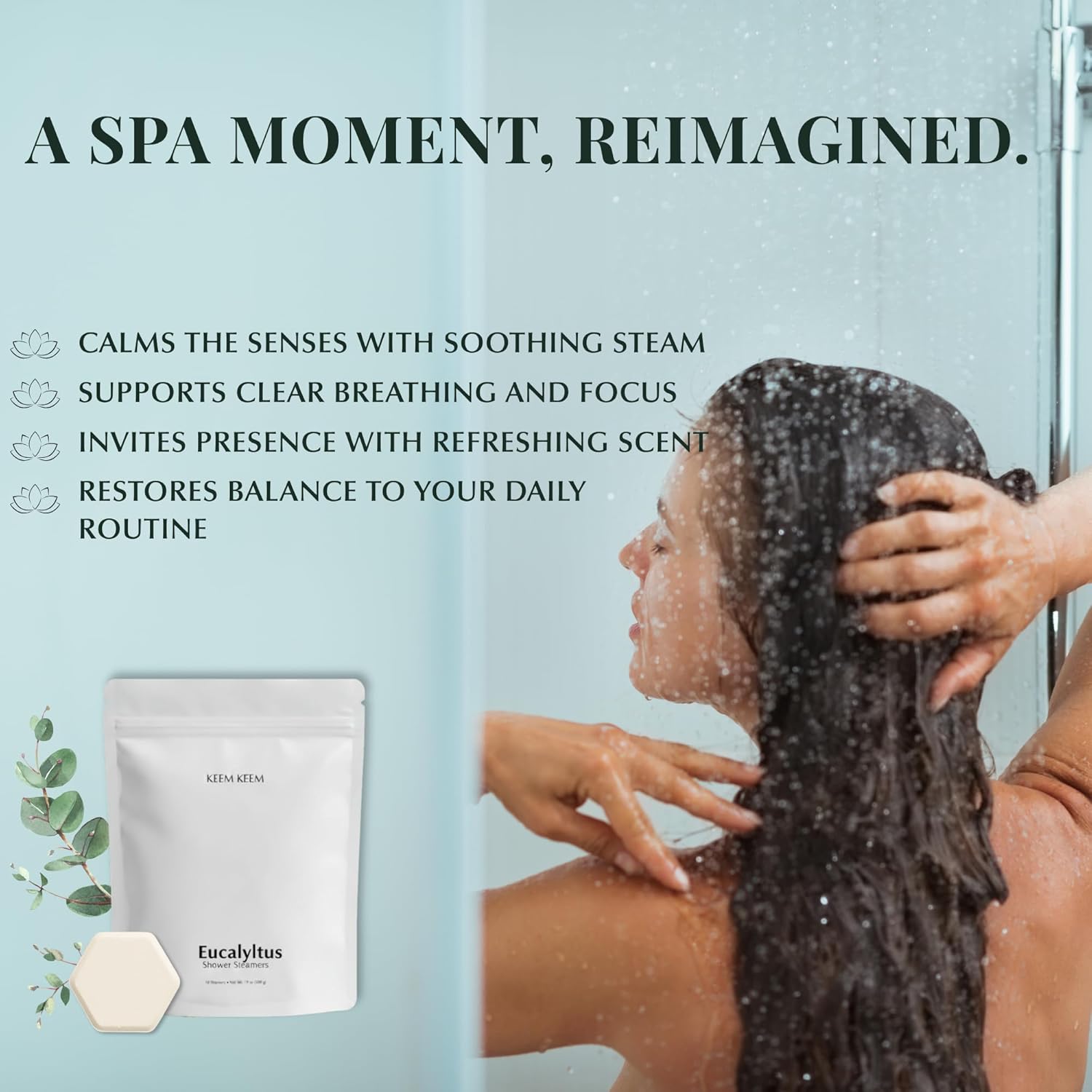 | Product Benefits | Aromatherapy shower tablets, Breathe easier, Eucalyptus essential oil, Natural ingredients, Sinus support, Stress Relief |