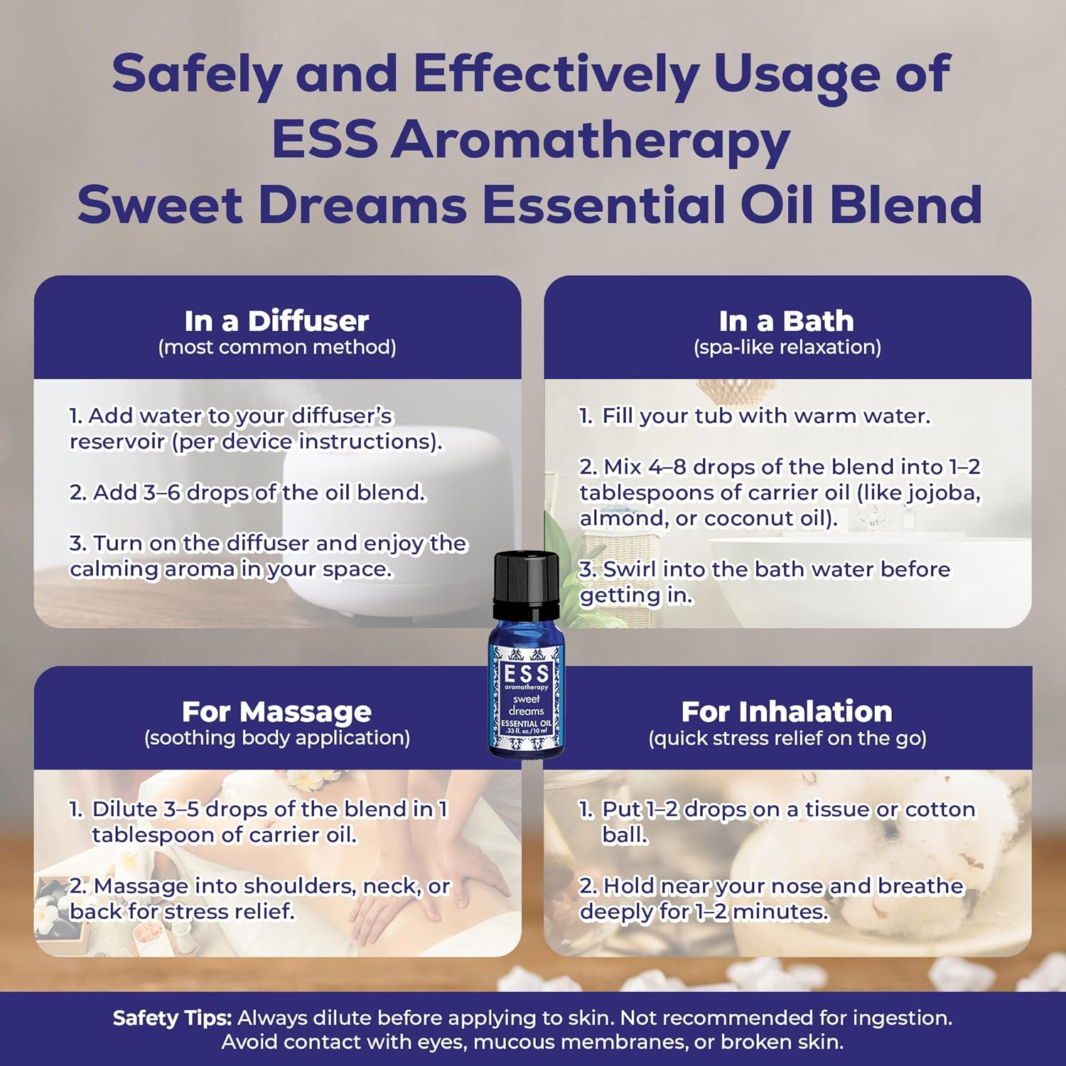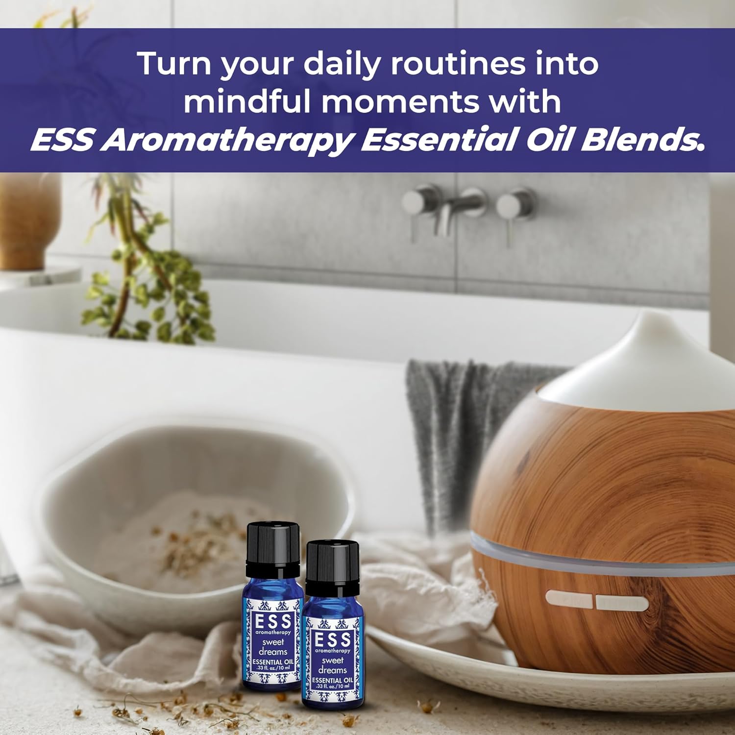 Create a peaceful and relaxing atmosphere with ESS Aromatherapy Essential Oil Blend – Sweet Dreams. This soothing blend is crafted with pure, natural essential oils to promote relaxation and help prepare your mind and body for a restful night’s sleep. Ideal for diffusing or using in a warm bath, the Sweet Dreams blend helps ease away the stress of the day with its calming and tranquil aroma. The convenient .33-ounce bottle is perfect for travel or bedside use, allowing you to enjoy a peaceful sleep environment wherever you are. Perfect for those looking to incorporate aromatherapy into their bedtime routine, this essential oil blend can be used with diffusers, humidifiers, or diluted with a carrier oil for direct application. Embrace the power of natural relaxation with the ESS Sweet Dreams Essential Oil Blend.
