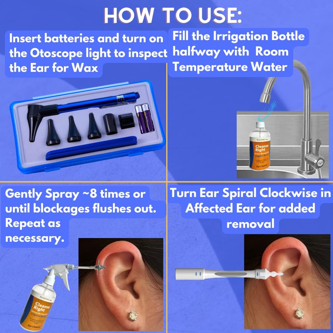 ★★★Check out our informational video above and to the left in the pictures to learn how to effectively use the Cleanse Right Ear Wax Removal Kit★★★Here at Blue Echo Care, we listen to customer feedback and have created the most comprehensive ear wax removal kit on the market. With a total value of $62.99 when all of these parts are purchased seperately, Blue Echo Care is commited to offering our customers the best prices possible for the greatest value when it comes to ear care.Description:Earwax occurs naturally as a deterrent from bacteria, foreign detritus and dust. Unfortunately though, some people produce too much of it and are affected by uncomfortable and sometimes painful blockages. These impactions are the leading cause of hearing loss, ear aches, tinnitus and can cause dizziness/vertigo. Most home remedies like cotton swabs and ear candling can worsen impaction and can cause long term damage of the ear. With the Cleanse Right Ear Wax Removal Kit, you can safely remove blockages without having to use ear drops or seeing a doctor. Included with the Kit:-Lighted Pen Otoscope (batteries included) - cost savings of $22.99-20 Disposable Tips - a market value savings of $12.99!!!-8 pcs Ear Wax Pick Set - a market value savings of $8.99!!!!-Spray Bottle and connector Tubes-Protective Splash Disk-Catch Basin for under the ear to catch any liquid run off-Rubber Bulb Syringe-8 PCs pick set for ear wax extraction ★★★Comprehensive instructions for this product are in the box and in the video of this title page. Always test the unit before usage!★★★