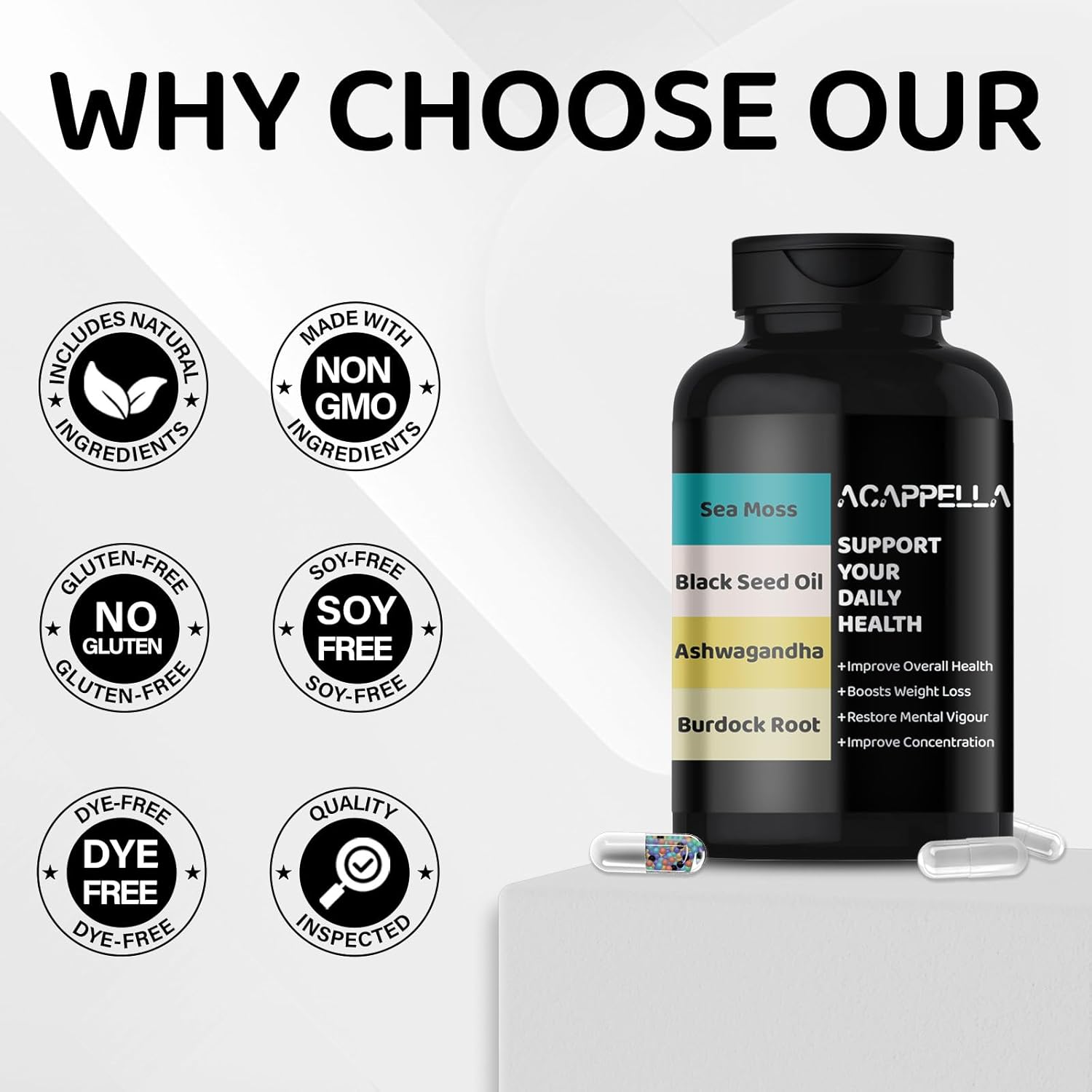 This ACAPPELLA Irish Sea Moss Capsules for both women and men is a powerful 15-in-1 multi-mineral blend. It combines ingredients like Irish sea moss, black cumin seed oil, turmeric curcumin, organic ashwagandha, burdock root, bladderwrack, chlorophyll, apple cider vinegar, manuka honey, and more. Packed into one convenient supplement, it offers a comprehensive alternative to multiple individual supplements, providing a variety of nutrients in an easy-to-take capsule form.
