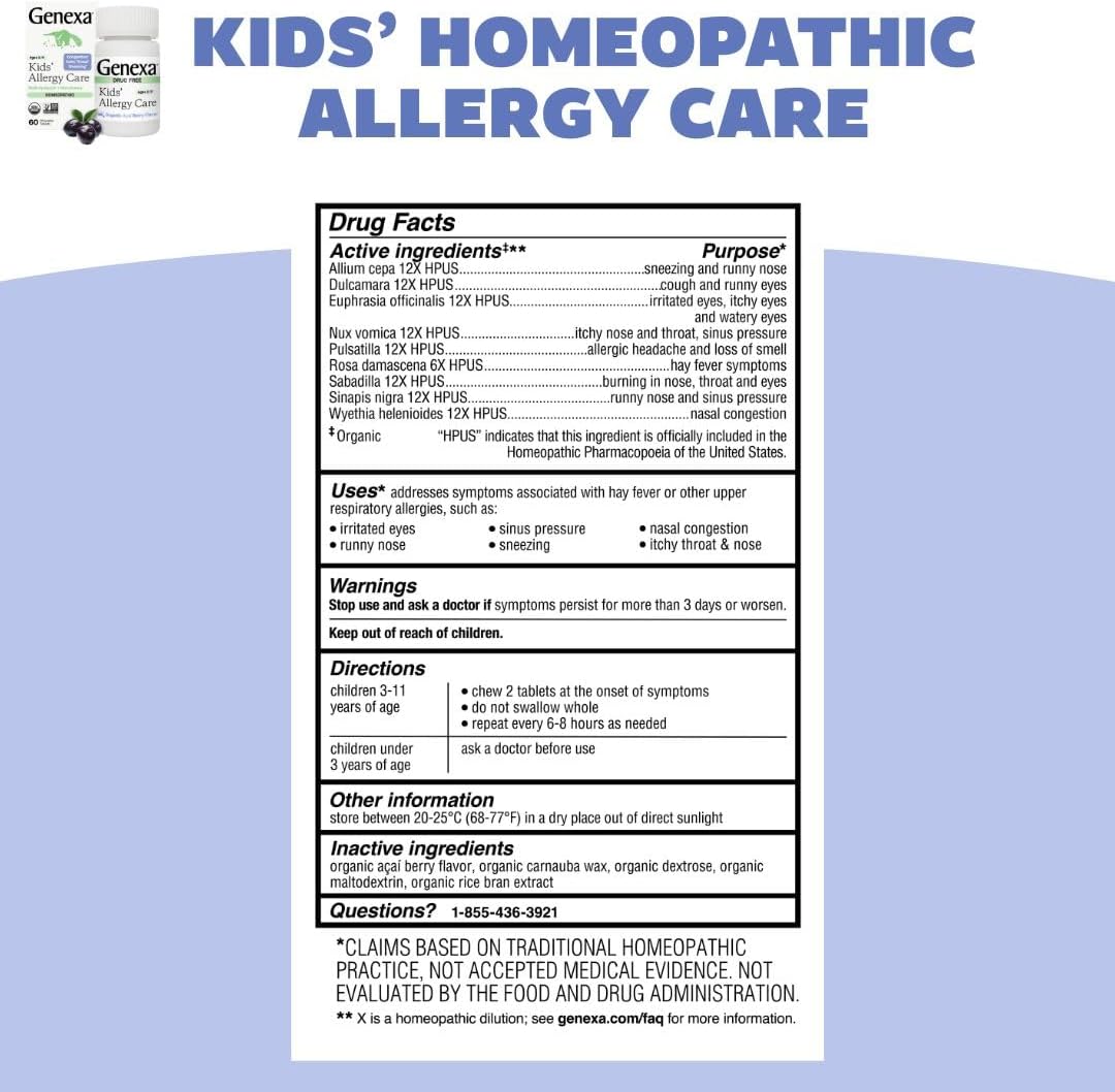 Support your child’s wellness with the Genexa Kids Allergy Bundle — a multi-symptom solution for allergy and congestion relief*. This convenient two-product bundle combines a gentle, drug-free chewable tablet for ages 3+ with a liquid formula containing Diphenhydramine HCI for kids 6 and up. This bundle provides kid-friendly relief* in both chewable and liquid formats. The homeopathic chewable tablets come in a delicious organic acai berry flavor, while the liquid medicine features a soothing organic agave taste. The powerful allergy liquid medication provides effective relief from runny nose, sneezing, itching of the nose, itchy, water eyes and more while the gentle homeopathic remedy is formulated to relieve nasal congestion*, itchy nose & throat*, sneezing*, and more*. Genexa’s commitment to clean medicine means both formulas are made without artificial sweeteners, artificial preservatives, dyes, parabens, or common allergens. The products are certified vegan, non-GMO and gluten-free. Whether you're looking for a gentle homeopathic option or an antihistamine-based formula, Genexa has you covered with clean relief for kids ages 6+. *Claims based on traditional homeopathic practice, not accepted medical evidence. Not evaluated by the Food and Drug Administration.