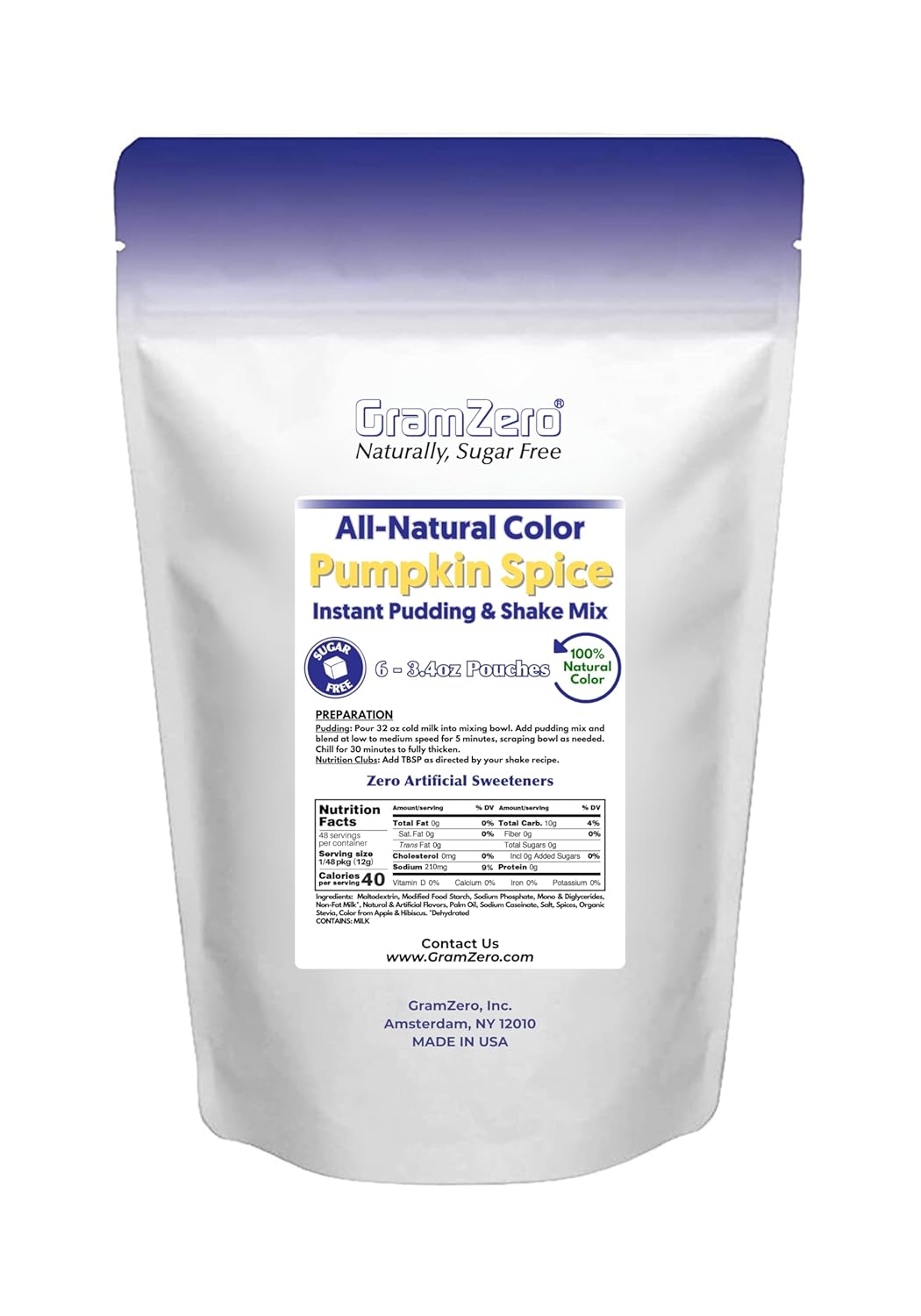 GramZero Naturally, Sugar Free Pudding Mix is sweetened with Organic Stevia for the best easy low carb dessert! Each sugar free instant pudding mix tastes just like the sugar sweetened puddings, however with no unwanted aftertaste, no sugar alcohols and no artificial sweeteners!Looking for Super Easy Low Carb Desserts? You’ve found the best stevia pudding mix that makes a quick low carb dessert that actually tastes good! GramZero products support a low carb diet and this sugar free pudding mix makes the best sugar free dessert that is definitely a low carb treat!Our low carb pudding mixes are also perfect to flavor Nutrition Shakes! Build your best meal replacement shakes with GramZero sugar free pudding mix flavors, you won’t be disappointed! At GramZero, we are a family owned and operated company. Our mission is to provide easy to use, great tasting and Naturally, Sugar Free products that help encourage healthy living! All GramZero products are sugar free and low or zero calorie, sweetened naturally only with Organic Stevia!Thank you so much for supporting our business! The GramZero FamilyInstructions - Easy Low Carb Dessert: Pour 4 Cups (32 fl ounces) of cold dairy milk into a mixing bowl and add the sugar free pudding mix pouch contents. Blend on low to medium speed with an electric hand mixer for 4-5 minutes, scraping sides of bowl as mixing. Place in the fridge to chill for 30 minutes to 1 hour to fully thicken, then enjoy! As a sugar free pudding mix, a 3.4 ounce pouch makes approximately 8 - 4 ounce servings.Instructions - Nutrition Club Shake: Use as the creamy flavoring powder, measured as directed by your club's Meal Replacement Shake Recipe.