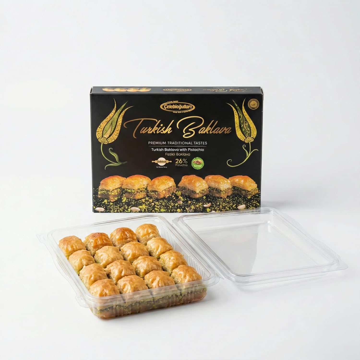 Discover the rich tradition of Turkish confectionery with Baklavacı Çelebioğulları Turkish Pistachio Baklava. This handcrafted Mediterranean dessert features delicate layers of thin pastry filled with 26% premium pistachios and baked with pure butter for a crisp texture and rich flavor. Sweetened without glucose syrup, it delivers a classic baklava experience inspired by traditional methods. Perfect as a gourmet dessert, thoughtful gift, or special occasion treat, this 500g box brings authentic Turkish pastry craftsmanship to your table. Storage Instructions: Keep in a cool, dry place. For best flavor, warm slightly before serving. Allergen Information: Contains wheat (gluten), milk, eggs, and pistachios. Net Weight: 500g (1.1 lb) Made in Türkiye 8681334000038