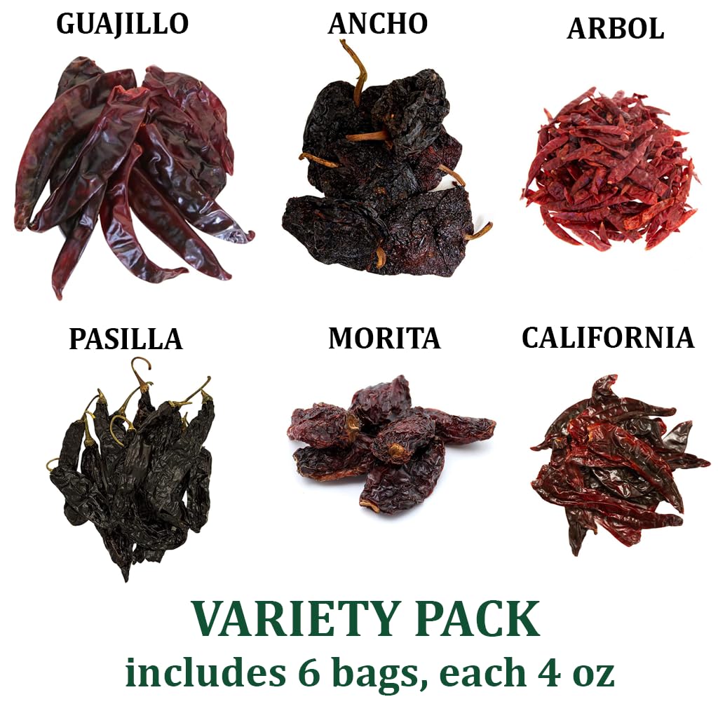 Discover the true taste of Mexican cooking with our Dried Chile Peppers Variety Pack by 1400S SPICES. This assortment brings together six of the most essential chiles used in authentic Mexican cuisine—Guajillo, Ancho, Pasilla, Arbol, California, and Morita—all selected for exceptional flavor and aroma. Whether you're preparing mole, birria, pozole, enchilada sauce, marinades, salsas, or homemade chili pastes, this 24-ounce value pack gives you the perfect balance of heat levels, colors, and flavor profiles to elevate every dish. Each chile is crafted by nature and preserved through careful drying so you can enjoy bold, complex flavors all year long. From the sweet, fruity notes of Ancho and the smoky richness of Morita to the fiery kick of Arbol, this collection offers unmatched culinary versatility. Rehydrate them for sauces, toast them for depth, or grind them into your own custom spice blends.