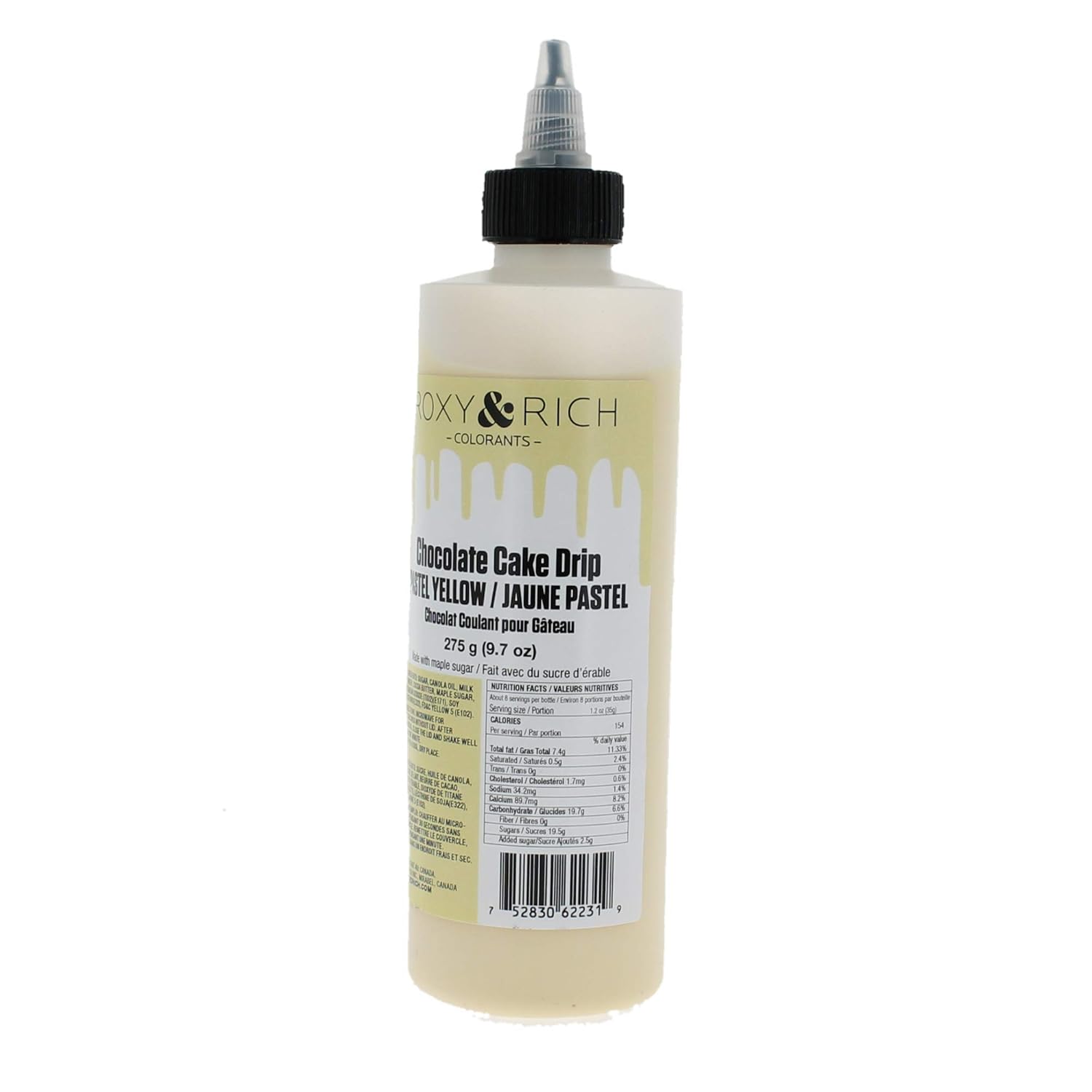 Roxy and Rich Chocolate Cake DripMade without any palm oil or by-products, ready in 30 seconds and easy to use, Roxy & Rich Chocolate Cake Drip can be used on cakes, as paint on butter cream, and for much more. Free of palm oils Nut free Gluten free Lactose free Vegetarian 100-percent edible Ready in 30 seconds Easy to use and to applyMade in Canada Usage: Frost your cake and let it sit in the fridge for 1 hour to allow the Chocolate Cake Drip to harden faster. To apply Roxy & Rich’s Cake Drip, remove the seal and the lid, and heat for 30 seconds in the microwave. Put the lid back on and shake for approximately 1 minute until completely smooth. Once the topping is complete, let your creation sit in the fridge at least 1 hour to allow the Chocolate Drip to harden.