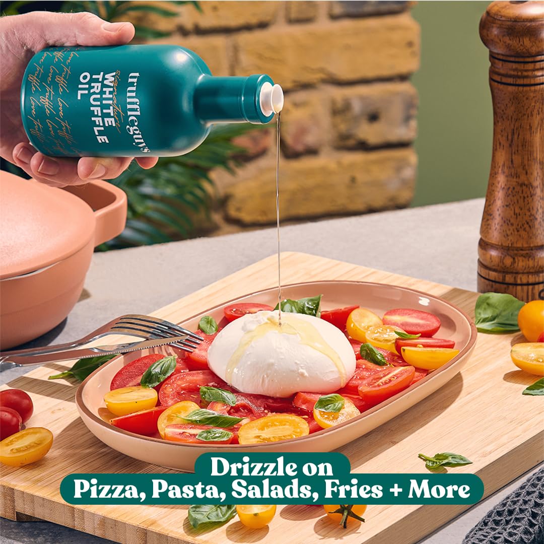 Our showstopping White Truffle Oil is made with some of the world’s finest white truffles (that’s Tuber Borchii for any Trivial Pursuit players out there). The hero of any dish, our delicate truffle flavour is gently blended with cold-pressed extra virgin olive oil to keep the aromas smooth yet powerful. Double concentrated for that intense burst, some like to call it ‘pure perfection’. It’s unapologetically magnificent. Our suggestion: The uses are endless, but we recommend drizzling on pasta, pizza and risotto. Suitability/Dietary information: Vegetarian, Vegan, Gluten Free