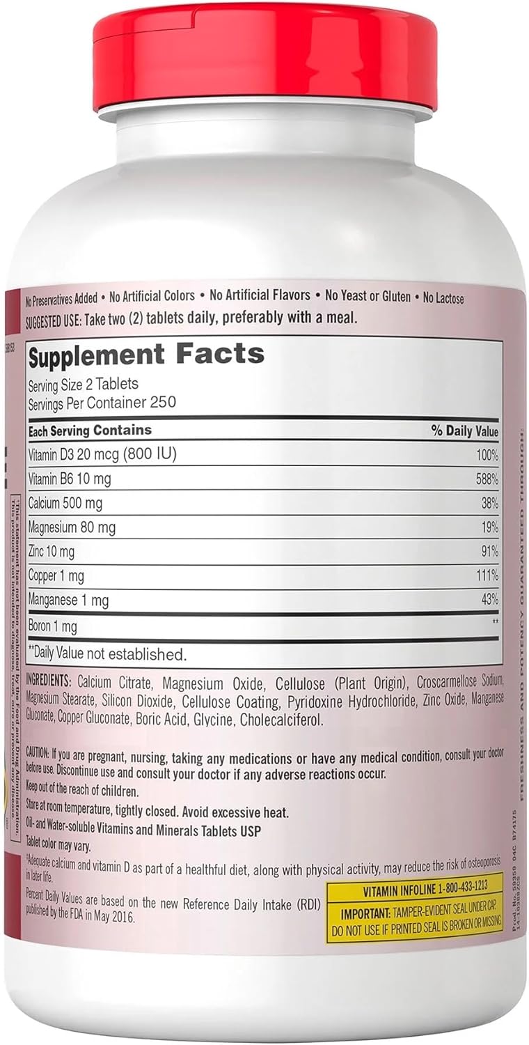 Signature Calcium Citrate, Magnesium and Zinc, 500 TabletsGet the benefits of essential minerals plus vitamin D. Each serving provides 500 mg of calcium, the primary mineral responsible for strong bones. This formula was carefully crafted to include vitamin D to assist with calcium absorption, as well as magnesium and zinc, two minerals involved in bone formation. The benefits of this product go beyond bone health to also support proper muscle contraction, a healthy immune system, and more!Signature Calcium Citrate, Magnesium & Zinc with Vitamin D3 provides essential nutrients important for supporting bone health. Over 99% of the body’s calcium is found in the bones and teeth where it provides structural support. Adequate calcium with vitamin D as part of a healthful diet, along with physical activity, may reduce the risk of osteoporosis later in life. Vitamin D helps develop strong bones and teeth by enhancing the body’s absorption of calcium. Magnesium is also essential for bone structure and it helps to regulate calcium transport. Zinc is involved in the synthesis of collagen, an important structural protein found in bone tissue.Features:Calcium Citrate 500 mg.Vitamin D3 20 mcg.Magnesium 80 mg.Zinc 10 mg.USP VerifiedSupports healthy muscle contractionFor strong bones and teethSuggested Use: Take two (2) tablets daily, preferably with a mealIngredients : Calcium Citrate, Magnesium Oxide, Cellulose (Plant Origin), Croscarmellose Sodium, Magnesium Stearate, Silicon Dioxide, Cellulose Coating, Pyridoxine Hydrochloride, Zinc Oxide, Manganese Gluconate, Copper Gluconate, Boric Acid, Glycine, CholecalciferolNo Preservatives Added. No Artificial Colors. No Artificial Flavors. No Yeast or Gluten. No Lactose. Warnings: If you are pregnant, nursing, taking any medications, planning any medical or surgical procedure or have any medical condition, consult your doctor before use.Discontinue use and consult your doctor if any adverse reactions occur.Keep out of the reach of children. Store at room temperature, tightly closed. Avoid excessive heat.