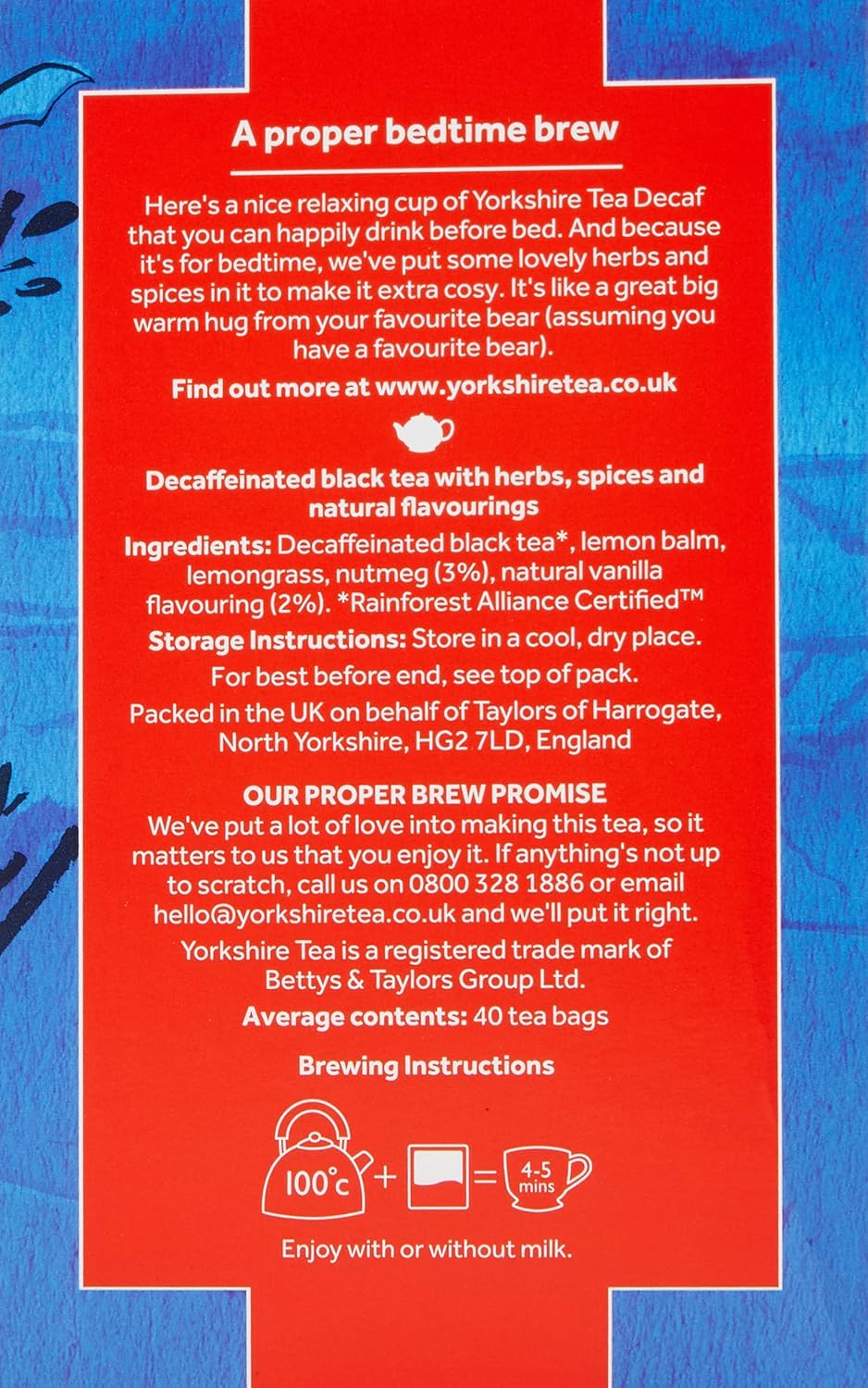 A proper bedtime brew Here's a nice relaxing cup of Yorkshire Tea Decaf that you can happily drink before bed. And because it's for bedtime, we've put some lovely herbs and spices in it to make it extra cosy. It's like a great big warm hug from your favourite bear (assuming you have a favourite bear).