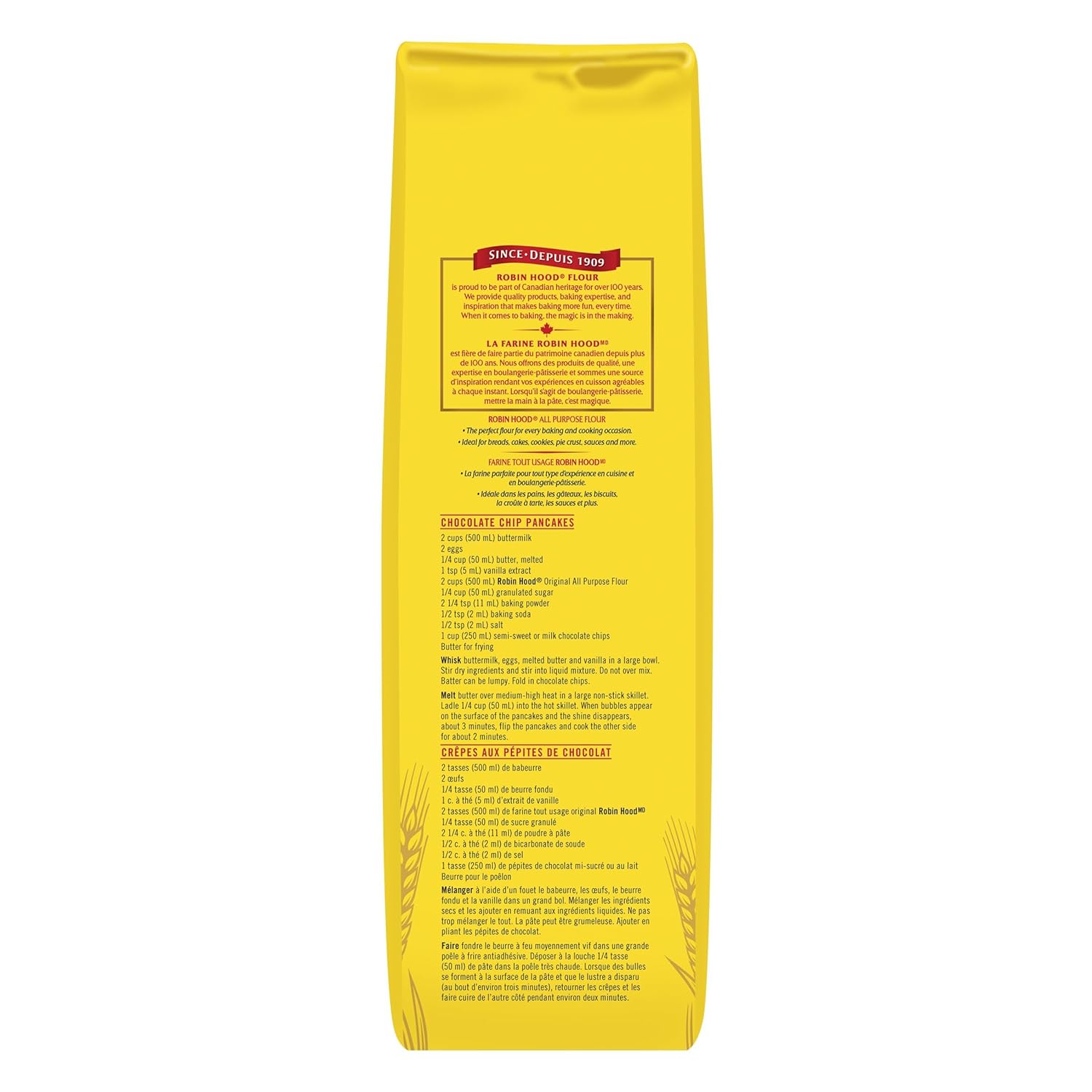 Robin Hood All Purpose Flour is milled from high quality hard red spring wheat and soft wheat, its protein content lies in between our Best for Bread and Best for Cake & Pastry flours, making it an ideal flour for your favourite recipes. All purpose flour milled from high quality hard red spring wheat and soft wheat. An excellent flour for every baking and cooking requirement. RECOMMENDED FOR MAKING: Cookies, Muffins, Biscuits & Quick Breads, Cakes & Cupcakes, Breads & Rolls, Pies & Pastries, and Bars, Squares & Brownies. Imported from Canada