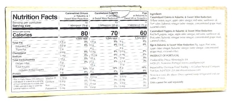 Gourmet Garnish Assortment. 8.82 oz per jar. Pack of 3. 1 Caramelized Onions 8.82 oz. 1 Caramelized Peppers 8.82 oz. 1 Figs in Balsamic & Wine Reduction 8.82 oz. Product of Portugal.
