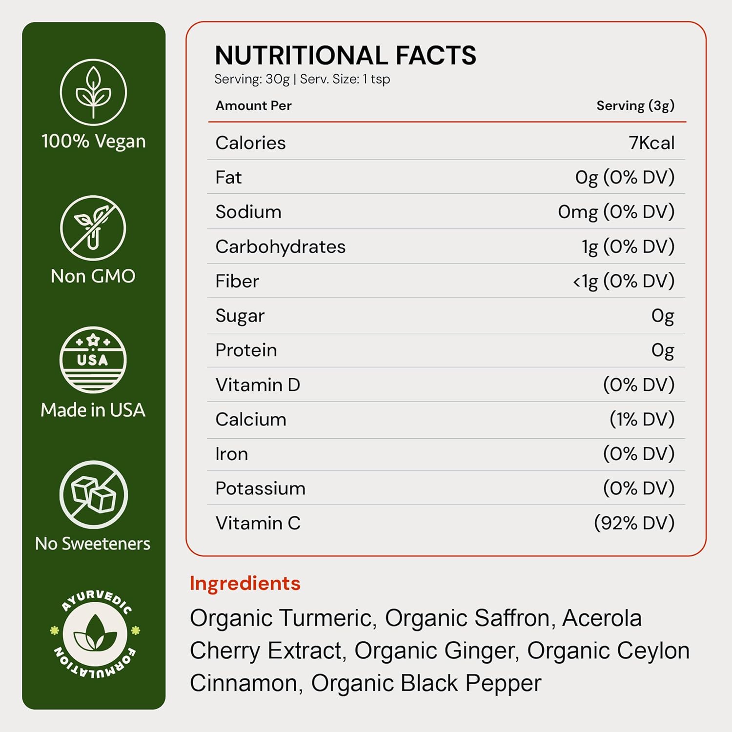 | Special Ingredients | Ginger, Saffron, Turmeric, acerola cherry |