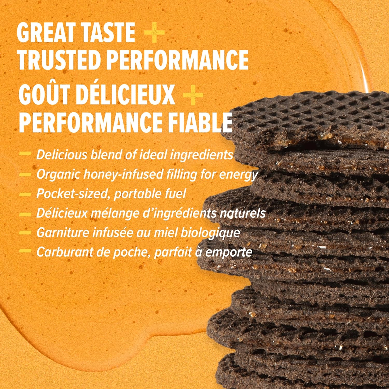A thin layer of honey infused with natural vanilla flavor and sandwiched between two thin waffles. The smooth taste of vanilla and honey will satisfy your taste buds and keep you going as an afternoon snack, during your favorite activity or go great with your cup of coffee or tea. Certified USDA organic.