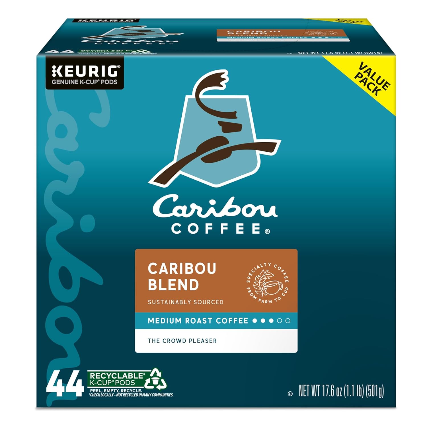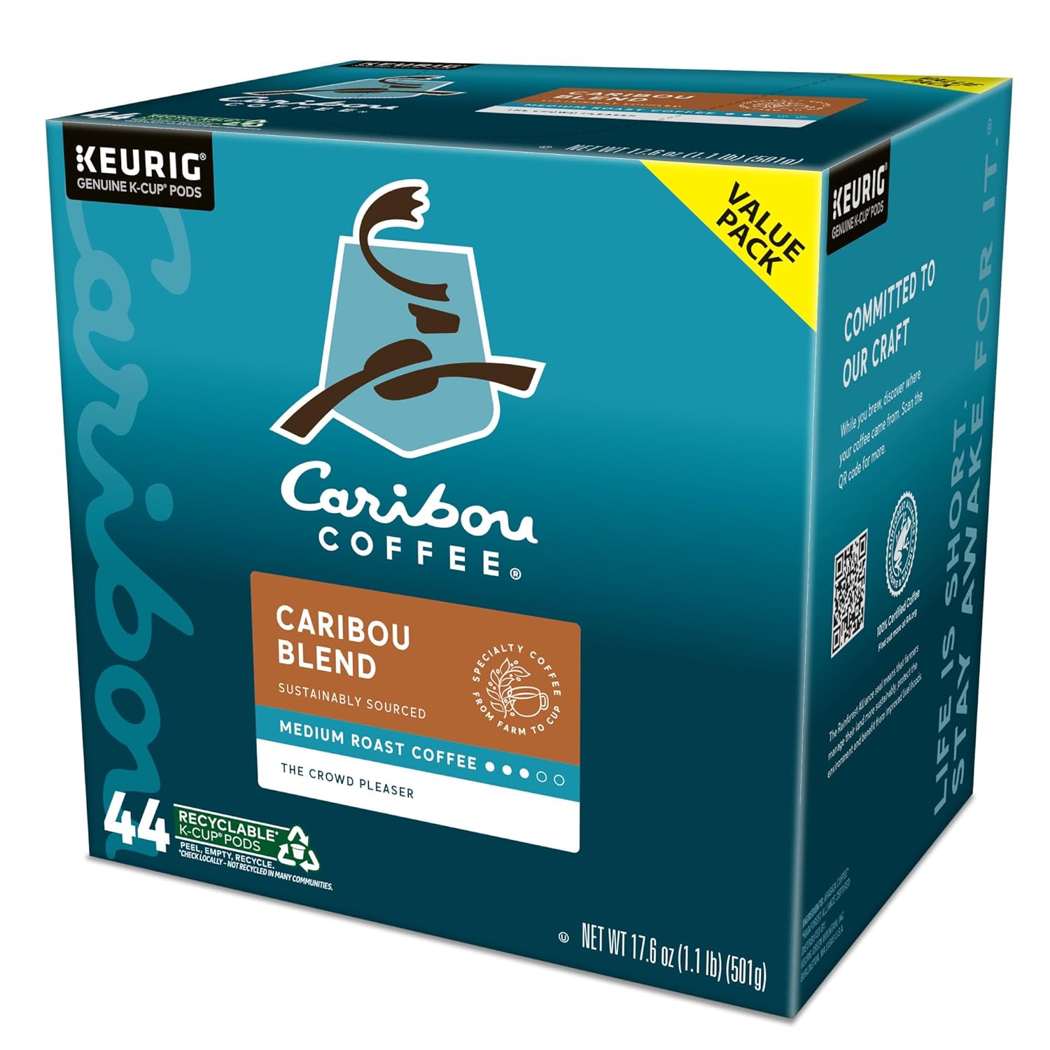A signature blend so good, we put our name on it. There’s nothing quite like the classic taste of Caribou Blend, a crowd-pleasing and approachable medium roast coffee. Woodsy spice notes from Indonesian beans stand out against a backdrop of caramelized sugar flavor from Central American varieties. The result is a sweet and well-rounded way to start your day. With its balanced acidity, milky body, and caramel-flavored sweetness, Caribou Blend is our most popular blend — from our cafés right to your cup. A thoughtfully crafted, expertly roasted expression that Caribou Coffee exists for those who believe life is not only what you make of it, but how you live it. In everything we say and do, we look for ways to delight consumers with an experience that goes beyond the expected. Each Caribou Coffee Caribou Blend K-Cup pod is filled with freshly ground, sustainably sourced coffee beans and is compatible with all Keurig single serve coffee makers. Simple. Delicious. And recyclable.* Enjoy the same great-tasting coffee you know and love, and when you’re done, just peel, empty, and recycle.*Check locally, not recycled in many communities.