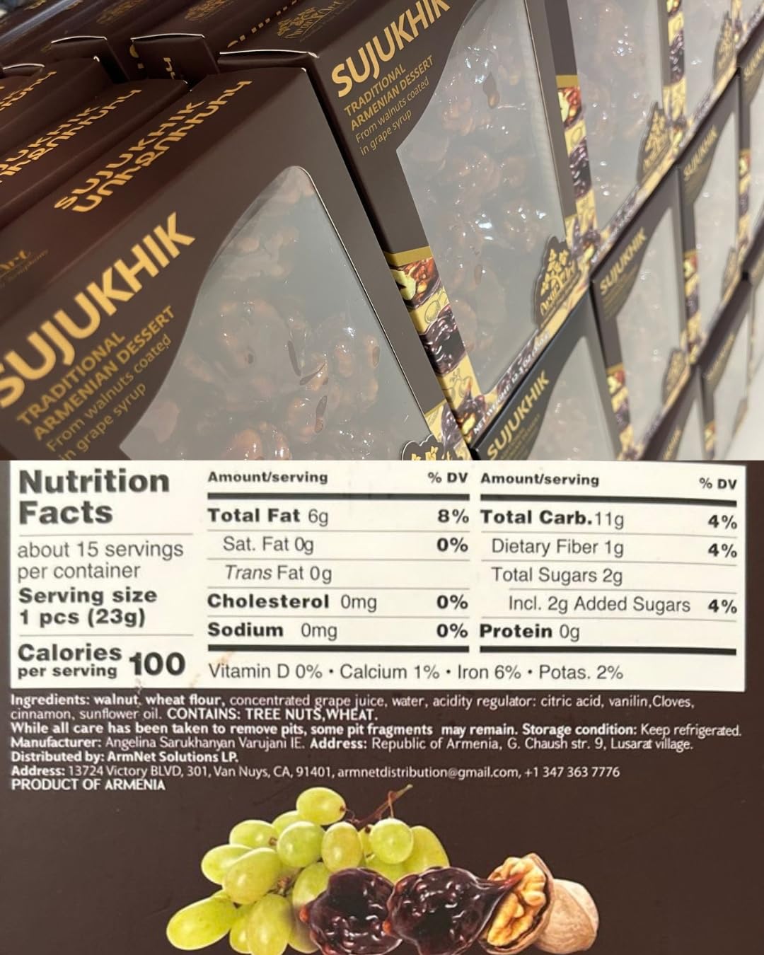 SWEETS SUJUKHIK – Premium Armenian Walnuts Coated in Grape Syrup | Only 2g Added Sugar | Healthy & Delicious Snack Experience the gourmet taste of Sweets Sujukhik, a traditional Armenian delight featuring fresh walnuts coated in rich grape syrup. With only 2g of added sugar, this healthy and indulgent treat brings together the natural sweetness of grape syrup and the crunchy richness of walnuts, making it the perfect snack for those seeking a delicious yet low-sugar option. Why Choose Sweets Sujukhik? ✅ Only 2g Added Sugar – Enjoy a naturally sweet, healthier snack with minimal sugar. ✅ Made with Fresh Walnuts – Full of nutrients and rich in healthy fats, perfect for a quick energy boost. ✅ Traditional Armenian Recipe – Handcrafted using authentic methods for an unforgettable taste. ✅ Perfect for Gifting – Packaged in a stylish gift box, making it the ideal treat for any occasion. ✅ Healthy & Delicious – A guilt-free snack that combines the health benefits of walnuts with the delightful taste of grape syrup. Whether you’re treating yourself or searching for the perfect gift, Sweets Sujukhik offers a unique and healthy way to satisfy your sweet cravings. 📦 Available in 12.3oz size – Order now and enjoy the irresistible combination of walnuts and grape syrup in every bite!