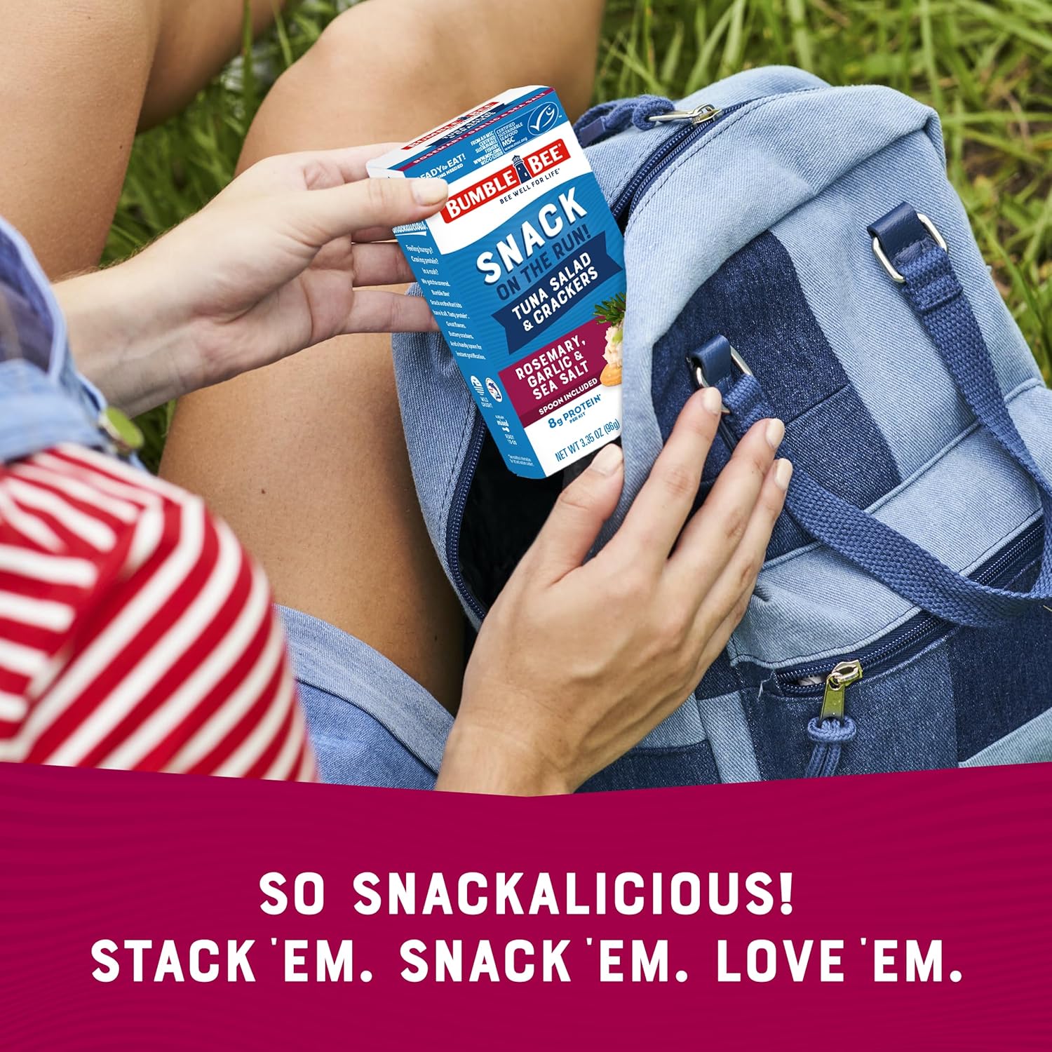 We get it, you're really busy. No, like we actually get it. That's why we made our Bumble Bee Snack on the Run! kits. Because being on the go shouldn't mean foregoing the finer things in life, like our beautifully filling tuna salad on crackers you can eat straight from the box. The trio of seasonings - rosemary, garlic, and sea salt - whipped into the most glorious tuna salad makes for one impossibly good meal on the go. All you have to do is open the box and dig in.