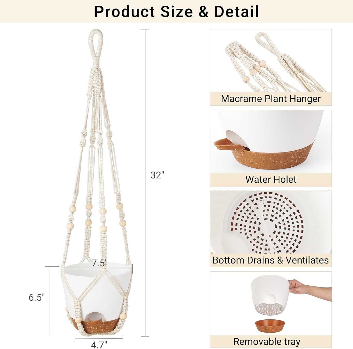 Package Included : Pack of 2 white plant hanging bracket with 7 mounting screws, 7 of each of 2 different expansion tubes and 2 packs 35" macrame plant hangers, 2 packs plastic selfwatering flower pots in 7.5" opening diameter and saucers, and 2 packs of hooks.