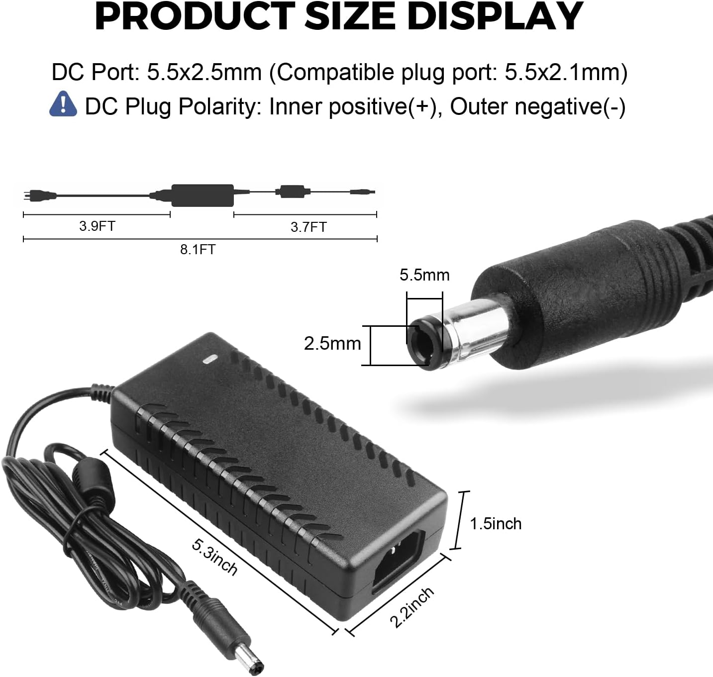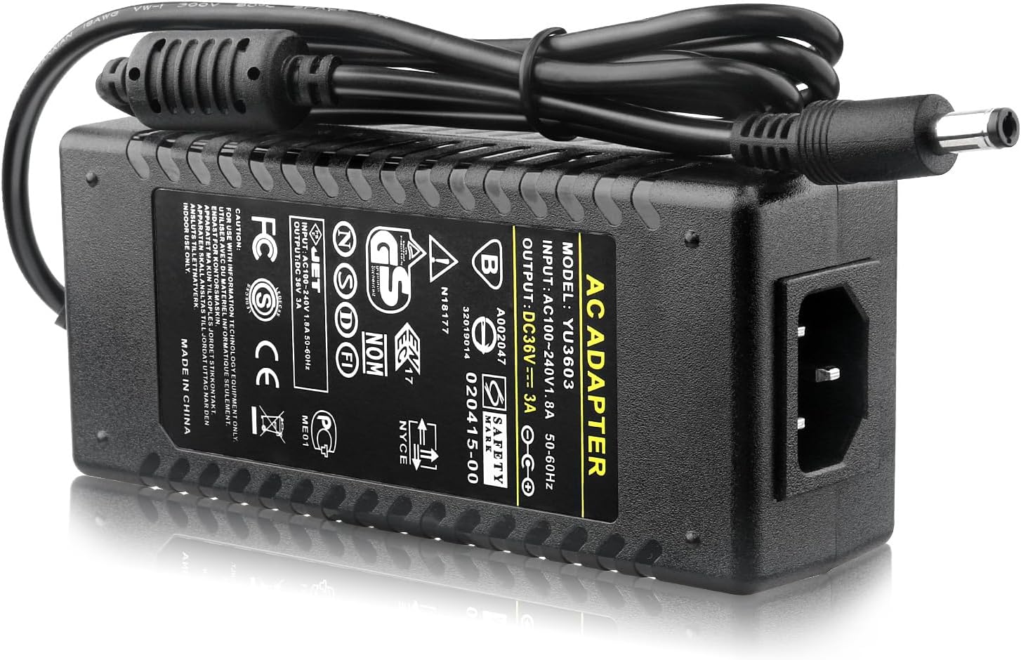 36V 3A Power Adapter Usage Range: 36V LED strip light, Water Purifier, Massage Chair, DC Motor, DC Pump, Inkjet Printer, Laser Engraver, Electric Drill and other 36V devices less than 108W. Product Specifications: --Input Voltage: AC 100-240V 50/60Hz --Output Voltage: DC 36V --Output Current: 3A --Output Power: Max 108 Watt --DC Jack Type: 5.5mm x 2.5mm (Compatible with 5.5mm x 2.1mm DC port)--DC Plug Polarity: Inner Positive(+), Outer Negative(-) --AC Power Cord Length: 3.6FT, DC Power Cord Length: 3.2FT --With IC Chip: Short circuit protection, Overload protection , Over voltage protection, ver temperature protection --Perfect replacement for 1A / 1.25A / 1.5A / 2A / 2.5A as amperage isnt forced. (If your previous Adaptor was less than 3A then this will be a perfect replacement as amperage is NOT Forced) Features: * Brand New and High Quality 36V 3A Power adapter.* True Ampere,so it won't overload within the rated ampere. * New IC Chip,so the performance of product will be more stable. * Factory aging test,so the life of product will be more secure. * New electron component,so the performance of product will be more excellent. Package List: 1 x 36V 3A DC Power Supply with Cord