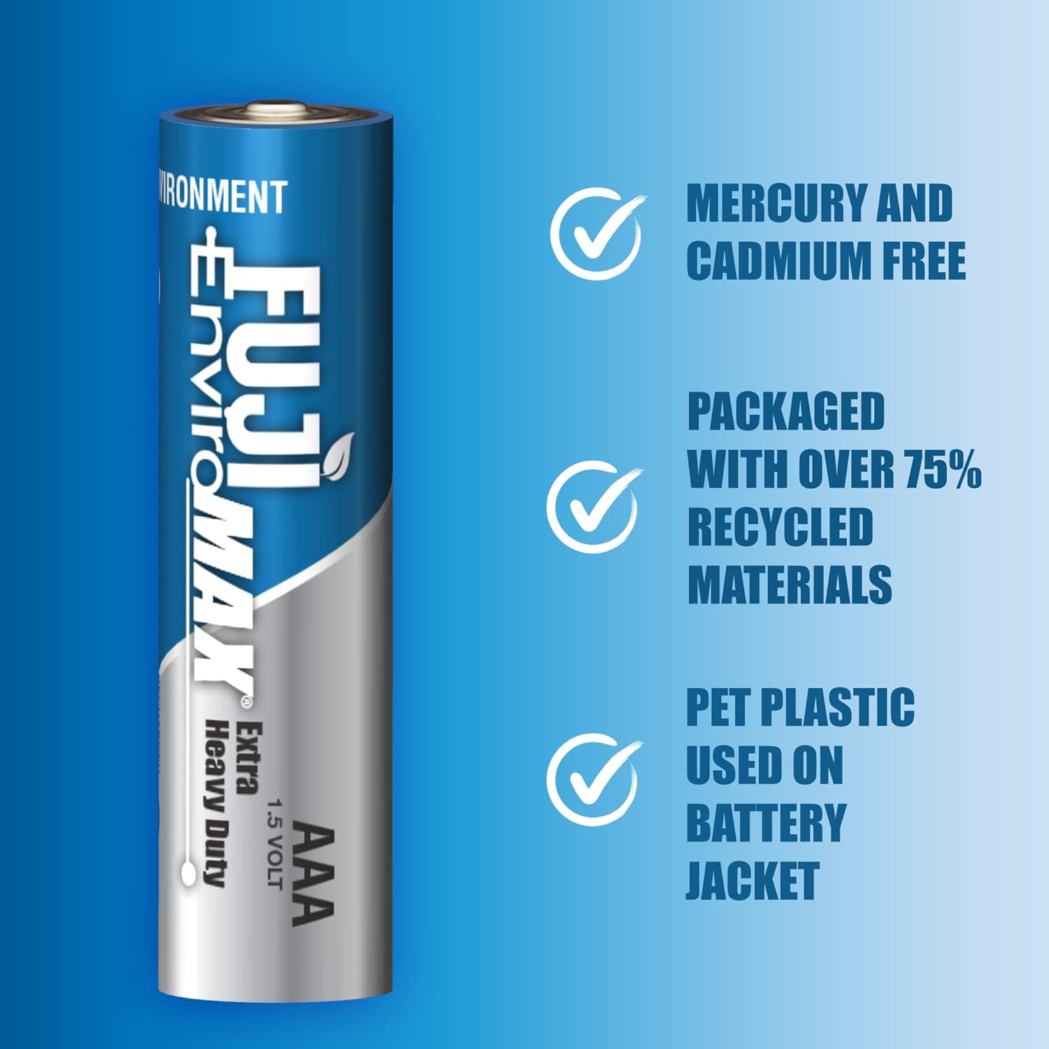 From Fuji comes Environmentally respectful yet powerful batteries-the enviromax extra heavy duty batteries! This 20 pack of AA batteries is ideal for low drain devices at a value cost. Fuji enviromax batteries are made in some of the world's most environmentally friendly battery plants that operate under some of the most strict standards of environmental responsibility. In fact, most of all resources used in the Fuji enviromax manufacturing process are reused and recycled! Even the Fuji enviromax batteries themselves are labeled and packaged with eco-friendly, 75% recycled materials and pet plastic! Plus, independent tests show Fuji enviromax batteries equal-and most often exceed-the performance and longevity of equivalent major brands.