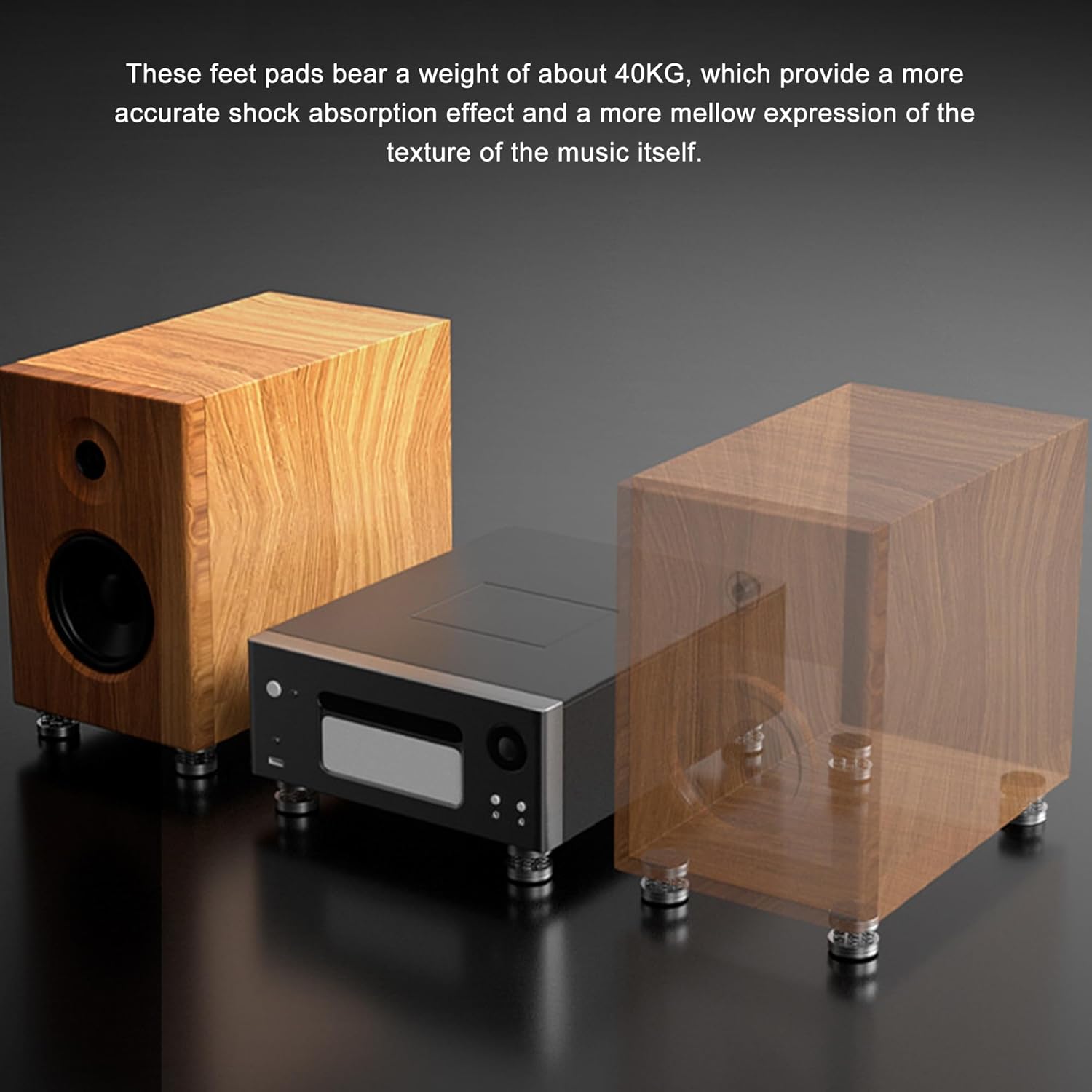 What is this? Audio equipment isolation feet and aluminum alloy speaker isolation spikes are widely used to reduce annoying noise in amplifier systems. Perfect for speaker isolation feet, amplifier feet, turntable feet, computer case feet, CD/DVD players, and other devices.What will I get? Size: 1.8x1.6inch(45x40mm) Material: Aluminum Alloy Package: 4 x Spring Feet PadsAre there any advantages of the product? Made of aluminum alloy, it is durable, non-fading, and not easy to oxidize. Can greatly reduce annoying noise in the amplification system. It can effectively improve the visual effect of the machine and absorb vibration, achieve higher quality listening enjoyment, and improve sound clarity, stereo imaging, and bass response.How to use it? It is usually placed at the bottom of the speaker so that it fits perfectly with the bottom of the speaker.What should I notice? Before installation, make sure the isolation pad and the speaker are at the same ambient temperature to avoid temperature differences affecting the isolation effect.