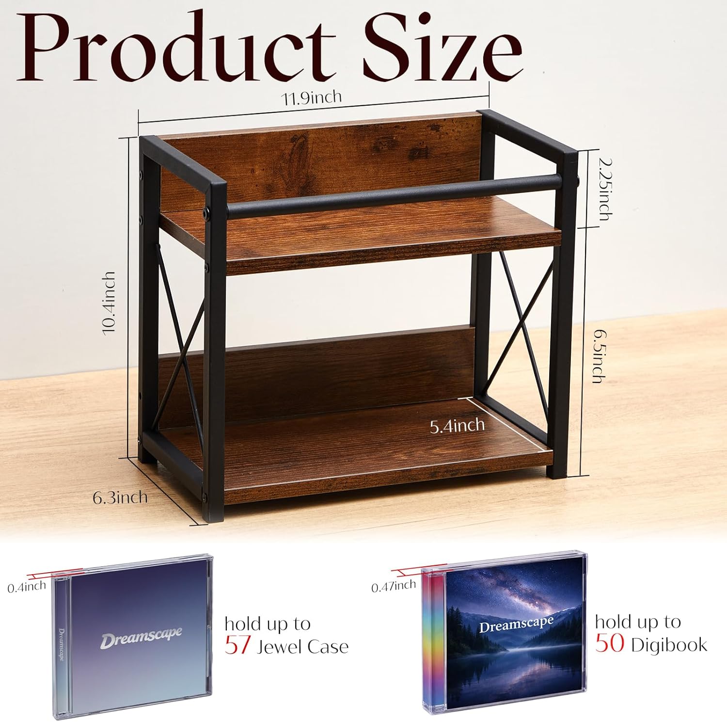 Features: Built with a solid frame, this CD display unit remains steady during daily use. It suits a variety of home environments and media storage requirements. This two tier CD rack design with larger capacity meet your growing record storage requirements. Specifications: Material: wood, carbon steel Color: brown, black Size: about 11.8 x 6.2 x 10.4 inches/ 29.97 x 15.75 x 26.42 cm Package includes: 1x Cd Storage Holder Notes: Manual measurement, please allow slight errors on size. The color may exist a slight difference due to different screen displays