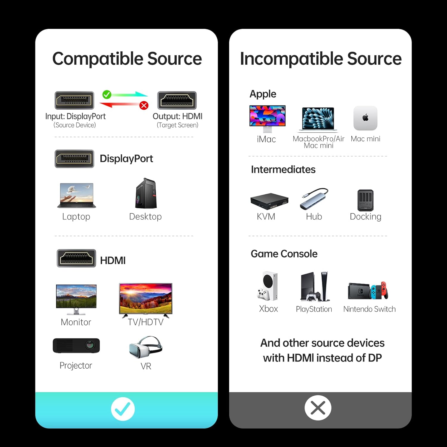 | Compatible Devices | Source (DP 1.4 Output): Desktop PC, Gaming PC, Laptop with DisplayPort 1.4 (NVIDIA RTX/GTX, AMD Radeon) Display (HDMI 2.1 Input): 8K/4K Monitor, TV, Projector, Gaming Display Important Compatibility Notes: This cable is unidirectional and only supports signal transmission from DisplayPort (source) to HDMI (display). It does NOT support HDMI output to DisplayPort input. Please ensure your device has a DisplayPort output. |