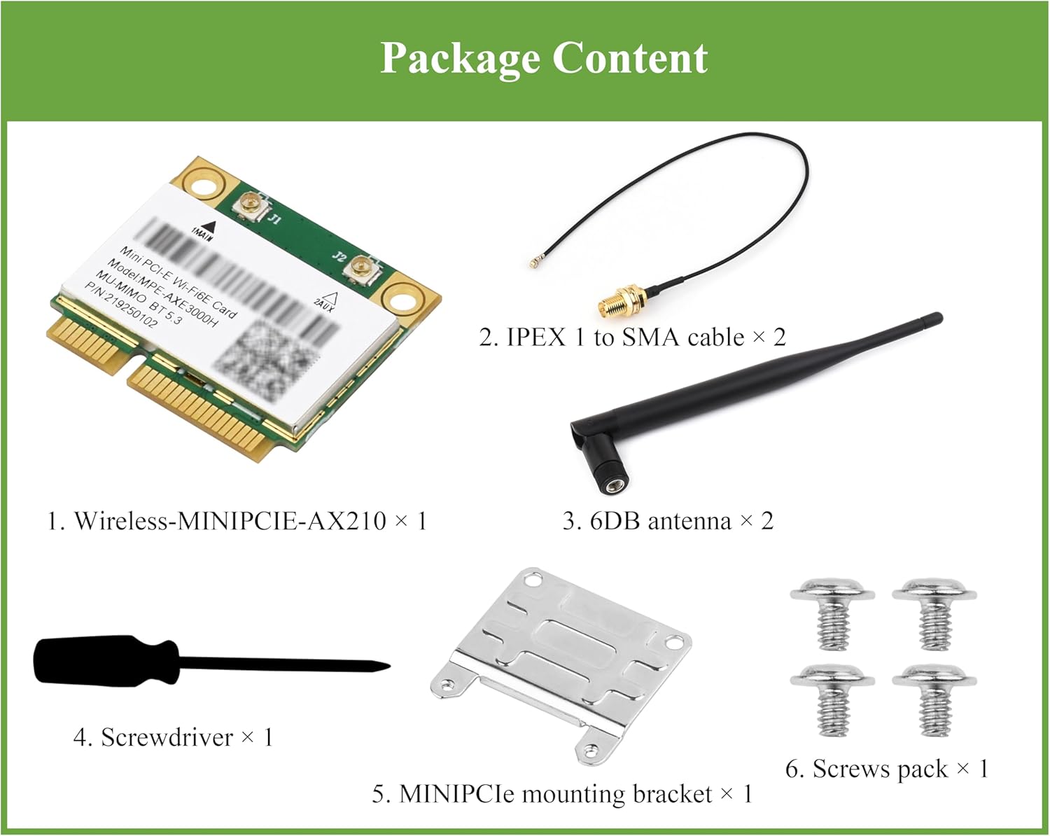 | BuiltIn Media | 6DB antenna × 2, IPEX 1 to SMA cable × 2, MINIPCIe mounting bracket × 1, Screws pack × 1, Screwdriver × 1, Wireless-MINIPCIE-AX210 × 1 |