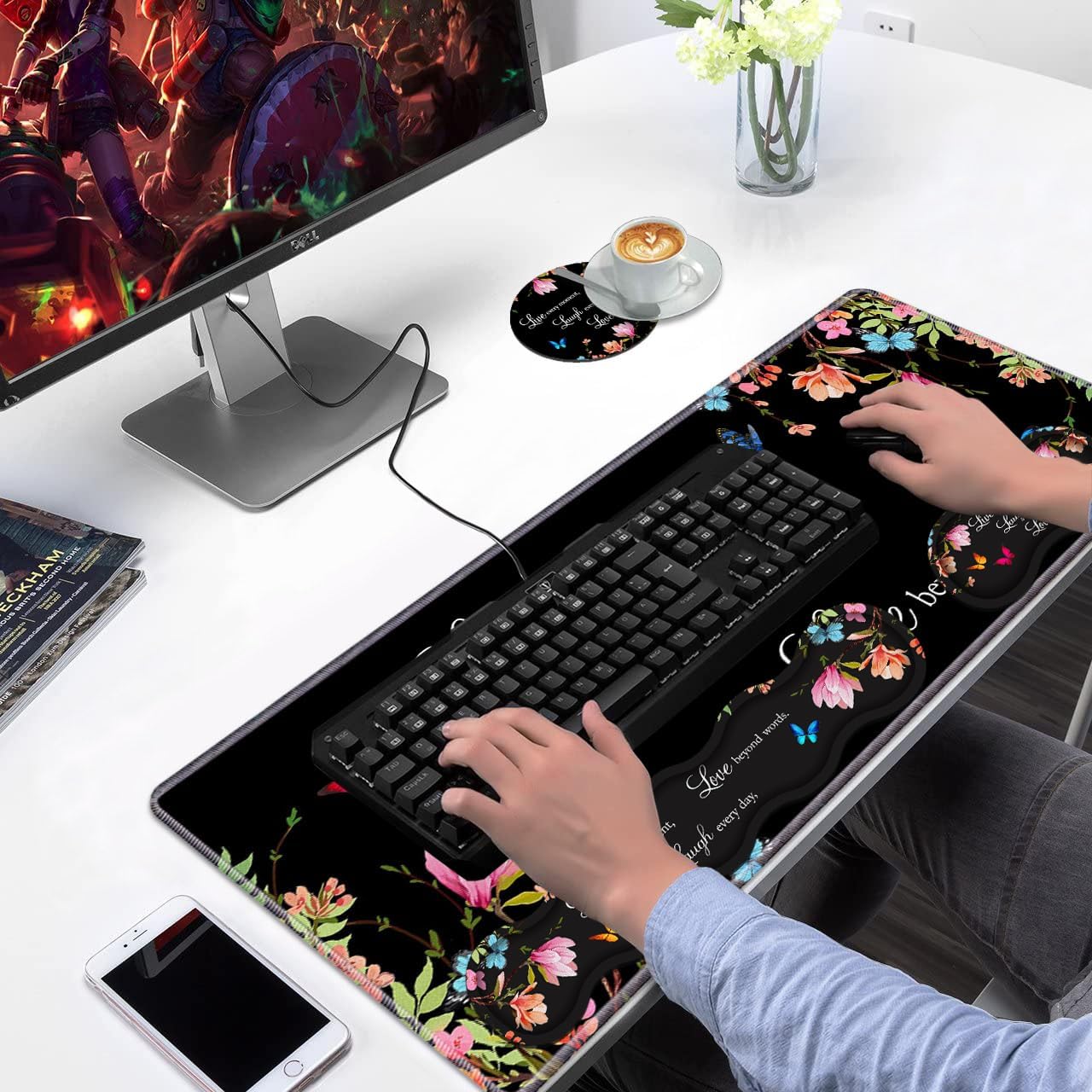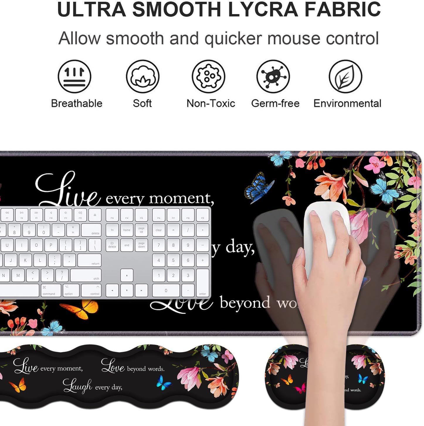 Ergonomic Large Mouse Pad and Keyboard Wrist Rest Set for keyboard and mouse, brightens up your workspace with fun and beautiful design; pretty and well made, work or gaming with more comfort.👉 Are you looking for wrist rest mouse pad set with vivid images in bright color?👉 Do you want to get a PC accessory to prevent carpal tunnel issues?If Yes, we just solve your problems NOW, Gaming desk pad with wrist support set is the right choice for you.Why You Choose Us☛ Huge size with excellent features make it applicable for many occasions like office workers, graphic designers, internet cafes, gamers, home use. Perfect partner of you computers, laptops, mac, desktops etc.☛ Wrist pad arc design fits the human wrist joints to keep the wrist in a natural and comfortable state.☛ Keyboard wrist & Mouse Wrist is made of cushioned neoprene, Non-toxic, no odor, harmless to health.☛ Allows more accurate and more fast mouse movement, and provides excellent point and click precision.☛ Non-slip rubber base provides heavy grip preventing sliding or unwanted movement.Suitable for different surface conditions.☛ High-definition printing, bright colors, easy to clean, not easy to fade.☛ Wrist support mouse pad with vivid printing, an exquisite attachment for home, office. An Ideal gift for families, friends, co-workers, etc.Package Included1 x Large Gaming Mouse Pad ( 31.5" x 11.8" x 0.12" )1 x Keyboard Wrist Rest Pad ( 17.32" x 3.54" x 0.98" )1 x Wrist Rest Support Pad ( 6.80" x 3.62" x 0.86" )1 x Cute Coasters ( 4" x 4" x 0.1" )Now, click "ADD TO CART" to get a worthy keyboard Wrist Rest & mouse pad wrist rest set, If you’ve any questions or concerns about the product, please contact us, we are always here to help.