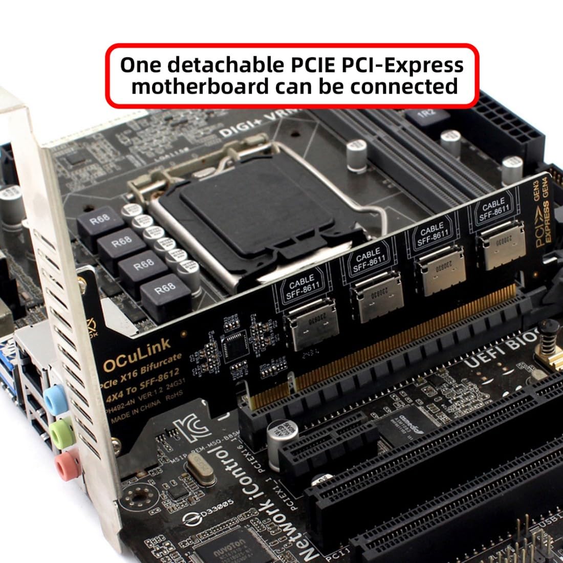 1) Only supports motherboards with detachable PCI-E channels.Control the operation of four disks based on the motherboard PCIE channel,The motherboard without PCIE signal split can only recognize one disk. 2) Oculink is the next generation of high-speed internal and external I/O connectors for PCI-E, compatible with T10/ SAS-4 24 Gbps, SFF-8611, SFF-8612, PCIe Gen 3 and Gen 4. 3) It can be connected e.g. one SSD or eGPU Graphics Card by using an optional cable. Suitable for small hosts, desktops, laptops, etc. to convert PCIE sockets to Oculink sockets, with fixing holes for fixing. 4) Support PCIE 4.0 data transmission, Data transfer rate up to 64Gbps, Support connecting GPU graphics card, SSD, expansion card, etc., backward compatible with PCIE 3.0/2.0. 5) Transform your works with this adapter, facilitating integration of PCI-E into systems requiring OCuLink connection;Elevates your system's capabilities with our adapter, ensuring a stable and robusts connection investments without compromising on space or convenience.