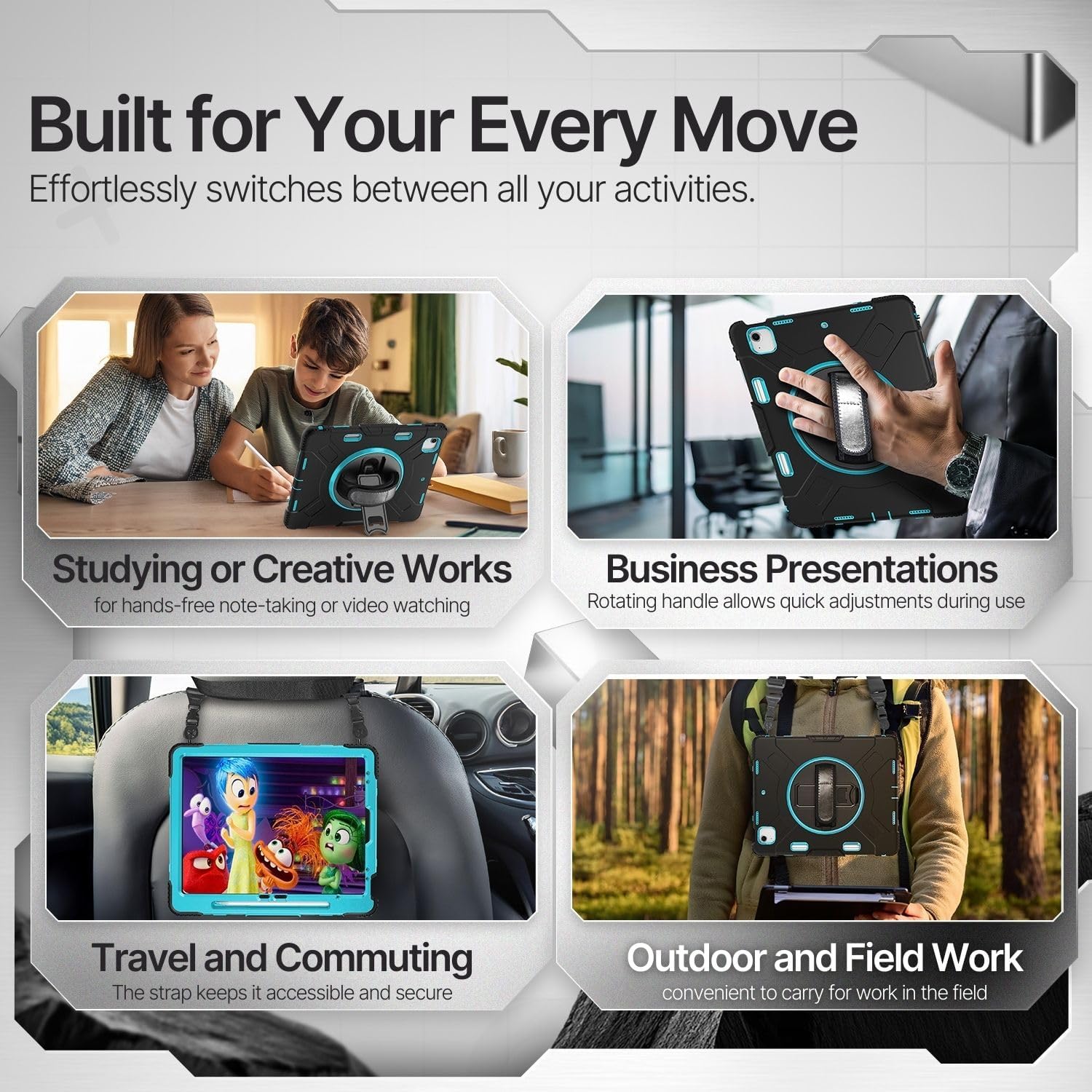 Keep your tablet pristine for as long as possible with our protective and functional case for iPad Air 13 Inch M2 6th 2024. Our case is extra robust and sturdy, holding against any potential damage. This case cover for iPad Pro 12.9 Inch features a heavy-duty 3-layer protection shell and 360-degree rotating hand strap and kickstand. Allows one-hand grip and comfortable vertical and horizontal viewing angles. It has an adjustable shoulder strap and pencil holder, perfect for on-site work, outdoors, and travels. This protective case will protect your device without worrying about accidental drops, bumps, and scratches.Specification:Color: MintMaterial: Liquid Silicone Rubber Cover / Hard Polycarbonate ShellCompatible with iPad Air 13 Inch M2 6th 2024( A2898 / A2899 / A2900 )Compatible with iPad Pro 12.9 Inch 6th 5th 4th 3rd Generation (2022 2021 2020 2018)(A2436 A2437 A2764 A2766 A2378 A2379 A2461 A2462 A2229 A2069 A2232 A2233 A1876 A2014 A1895 A1983)PLEASE NOTE:1. This carrying case is ONLY compatible with the mentioned models.2. Device and Pencil is NOT included in the product3. Screen protector film is NOT included in the productPackage Content:1x Protective Case for iPad Air 13 Inch M2 6th 2024 & iPad Pro 12.9" 6th/5th/4th/3rd Gen (2022 2021 2020 2018) - Shockproof Cover w/ Pencil Holder, Handle, Adjustable Stand & Shoulder Strap, Mint