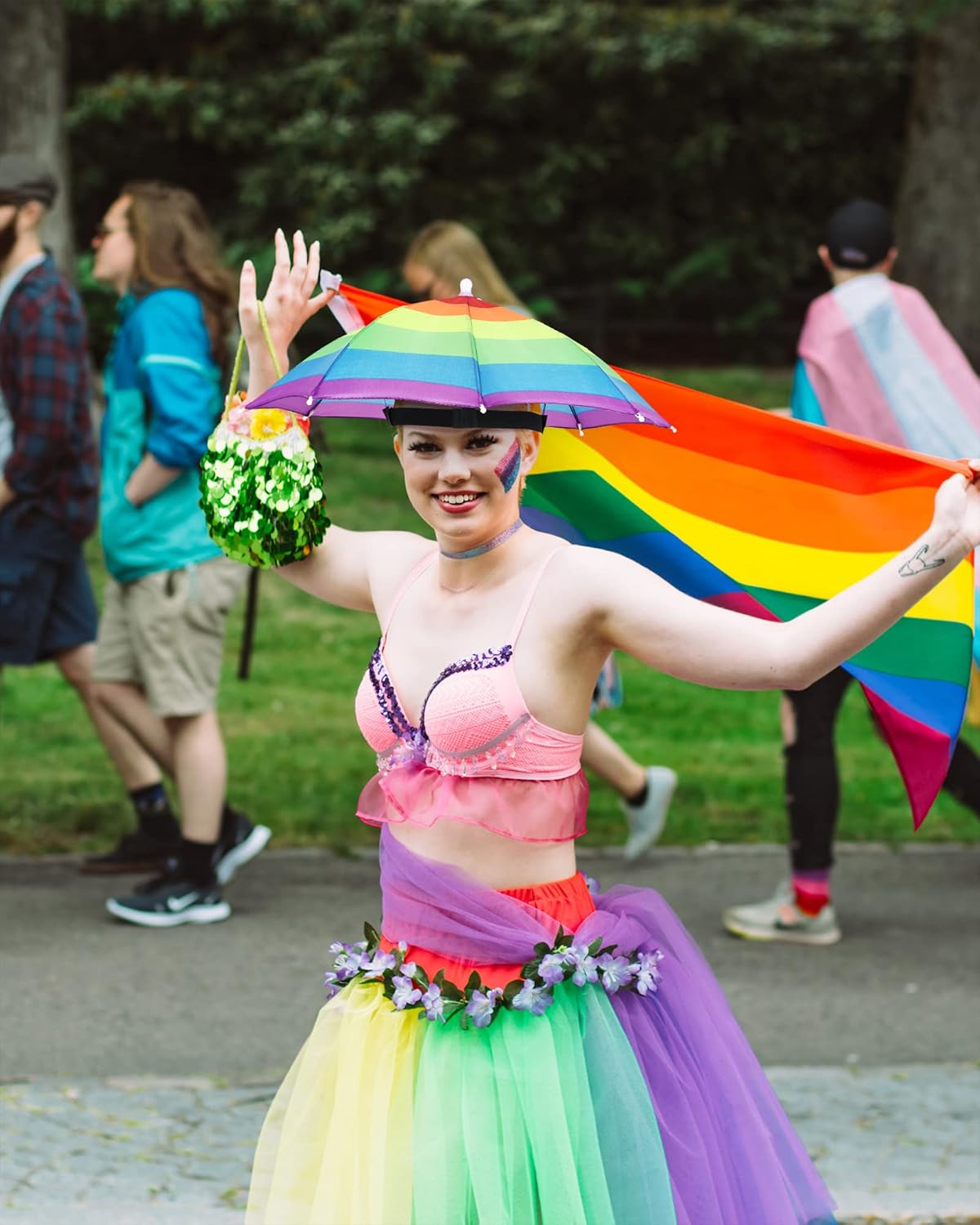Features: The headband umbrella hat is lightweight and foldable, you can fold it up and put it in your bag or gym bag. The folded hat doesn't take up much space. You can send the elastic headband umbrella to your family members, boyfriends, girlfriends, gays, lesbians, bisexual friends and more, to show your love and care to them. Specifications: Material: nylon fabricColor: multicolorSize: about 20 inches/ 52 cm in diameter, about 12.6 inches/ 32 cm in lengthPackage includes: 12 x Umbrella hatsNotes: Manual measurement, please allow slight errors on size. The color may exist a slight difference due to different screen displays.