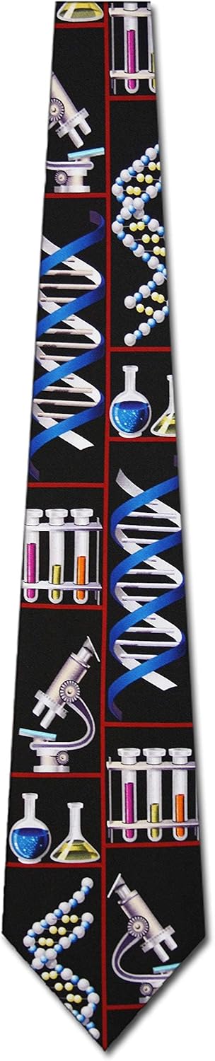 Time to put on your lab coat and take a step into the lab with this Chemistry lab necktie. This science necktie features a bold block pattern with a laboratory theme. The Chemistry Lab necktie depicts squares that include various lab tools along with double helix and molecule models. This Chemistry Lab tie is the perfect science themed gift! Time to put on your lab coat and take a step into the lab with this Chemistry lab necktie. This science necktie features a bold block pattern with a laboratory theme. The Chemistry Lab necktie depicts squares that include various lab tools along with double helix and molecule models. This Chemistry Lab tie is the perfect science themed gift! This tie is standard adult size (both in length and width) and should fit most adult men. That said, if you're extremely tall, short or a hulk of a guy and are not sure if this tie will properly fit you, please give us a call. We'd be more than happy to assist.Hand crafted in 100% microfiber to provide years of enjoyment. Brand Three Rooker Length Standard Adult - Approx 57 Inches long Width Standard Adult - Approx. 3.75 Inches Material 100% Microfiber Background Color Black