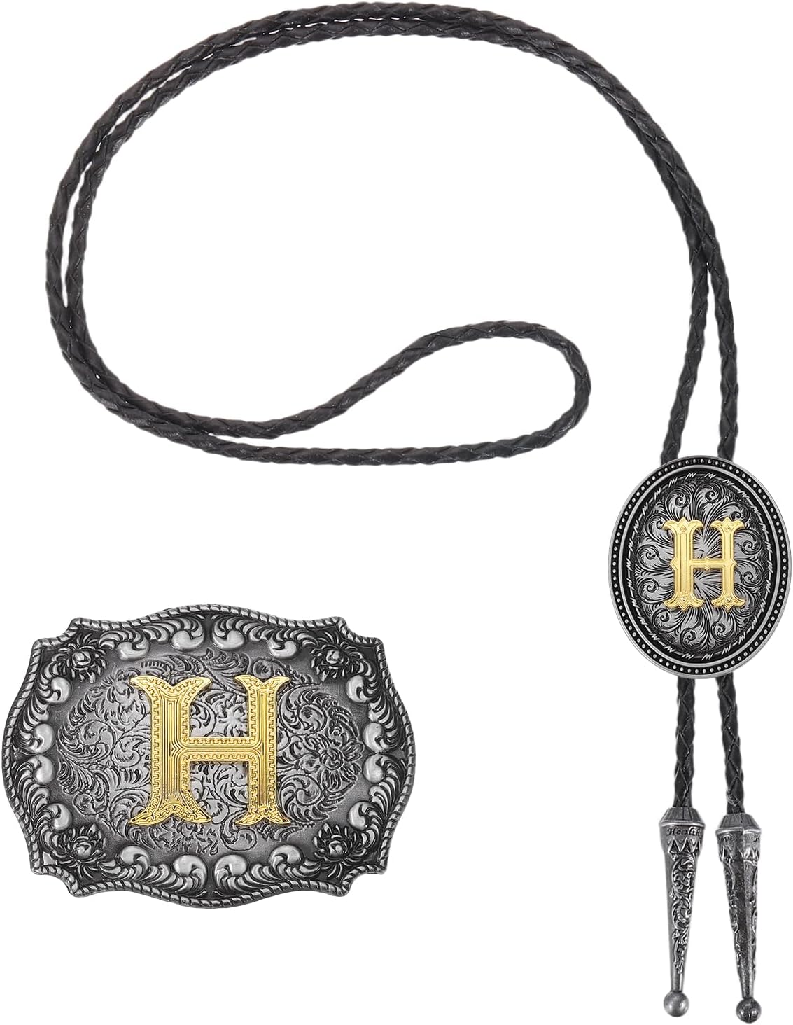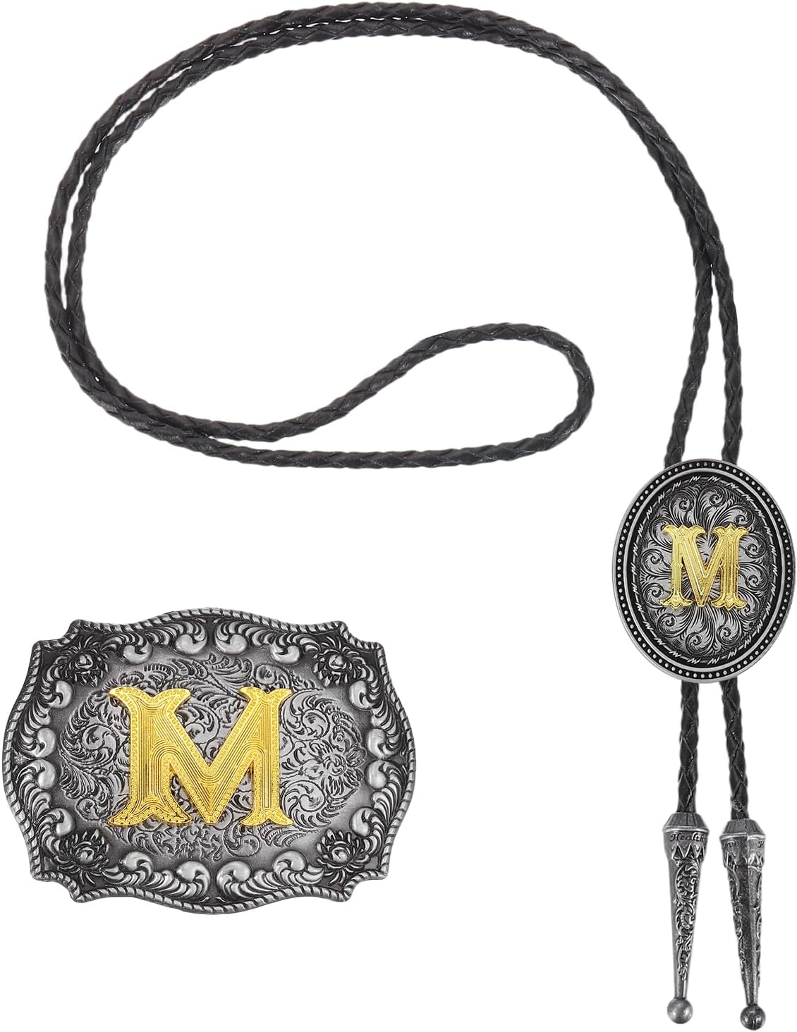 A cowboy bolo tie and belt buckle suit masquerade parties, adding Western style to cowboy or girl's outfits. They also work for Western-themed weddings, festivals, and parties, and can elevate casual looks, such as jeans with a plain shirt to avoid simplicity. This set is a unique accessory with distinct style, different from the sense of regular ties.Advantage A-Z Golden Initials: This set has gold initials from A to Z. Pick one matching your name or preference, adding a unique touch that stands out.Premium Materials: Crafted with genuine leather cord that is flexible and durable, plus good-quality metal with a sturdy slider. It ensures long-lasting use and comfortable wear for daily or occasion wear.Western-Themed Occasions: Suitable for men and women. Perfect for Western weddings or anniversaries to complement any outfit, versatile and practical.Instruction Wear the bolo tie around your neck, adjust it to your desired length, and secure it with the metal clasp on the back of the tie's monogram. If using a belt buckle, simply secure the buckle to your belt.NOTE: Please note the size and quantity before purchasing. This product does not include any belt-making tools.