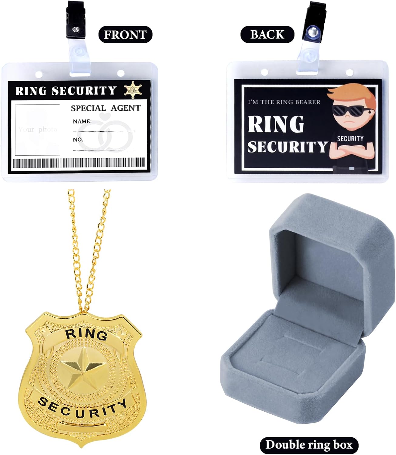 Are you looking for a charming and unforgettable way to involve a special someone in your wedding ceremony? Look no further than our Ring Security Wedding Ring Bearer Set! This delightful package is designed to add a touch of fun and sophistication to your wedding day, ensuring your precious rings are in safe hands as they make their way down the aisle. Features: 6 pieces in one pack,all-inclusive and cost-effective set A variety of collocation for choice Increase the joyful atmosphere of the wedding ceremony Specification: Material:plastic Box size:22.5x15.5x4.5 cm/8.86x6.1x1.8 inch Shade size:12.1cm/4.8 inch in total width,12.8cm/5 inch in temple length Color:As the picture shows Package includes: 1 x ring bearer briefcase 1 x kids sunglasses 1 x earpiece 1 x ring box 1 x ring security ID Card 1 x ring security badge Note: 1.Manual measurement,please allow slight errors on size. 2.The colors may exist slight difference due to different screens.
