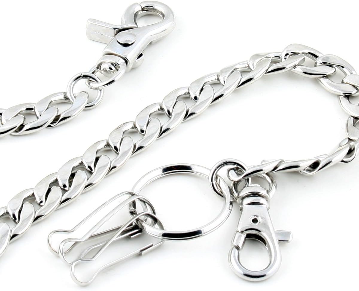 The wallet chain is made of tough chrome plated steel for a hardcore style extra long wallet chain. Use this chain as a standard jean chain to add style to any pair of jeans or attach the clasp end to any wallet with an eyelet to protect your money and identity. This wallet chain features a beefy, lobster claw clasps to attach to your belt loop, a durable steel clasp to attach to your wallet or belt loop and a rugged key hoop so you can also attach your keys, keeping all your stuff protected. Warm Tips: 1. Please make the product far away from the fire, toxic, corrosive, and chemical things. 2. In order to make the bag chain keep bright, please using soft cloth wipe it.