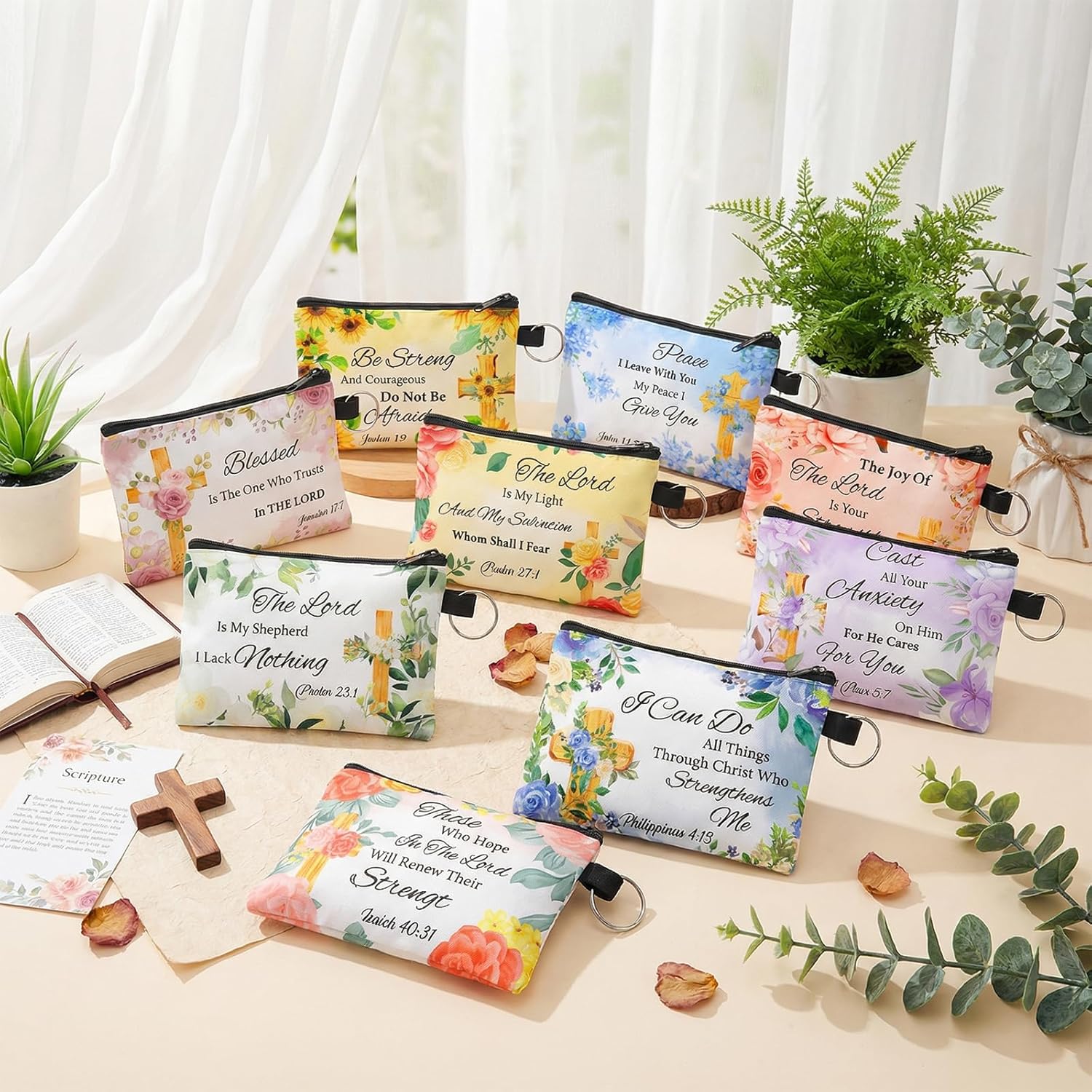 Features: Add organization and spiritual encouragement to your life with this beautiful and meaningful Bible-themed coin purse set! The small gifts for women set contains 30 purses in 10 different inspiring Bible verses and floral designs. Each purse measures 5.1 x 3.9 inches and is made of smooth, high-quality polyester fabric with reliable metal zippers to effectively protect your belongings from wear and tear. These sturdy and durable small coin purses are perfect for organizing change and are also durable enough for everyday use. They are not only the perfect small cosmetic pouch for storing coins, cards, and jewelry, but also a portable reminder of faith. Whether as a gift for a mother or a Christian friend, or a bulk gift for church events, this beautiful, practical, and meaningful set is an excellent choiceSpecifications:Product Size: 5.1 x 3.9 inchesProduct Quantity: 30Product Color: Multiple colorsMaterial: PolyesterPackaging Dimensions: 10.2 x 6.6 x 1.9 inchesPackaging Weight: 16.93 ozNotes:1. Manual measurement, dimensions may vary slightly2. Due to screen limitations, colors may vary slightly