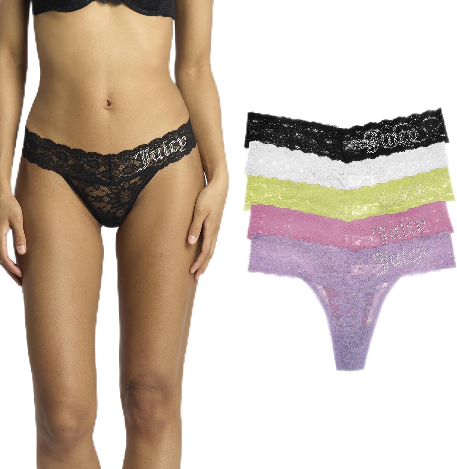Juicy Couture is internationally identified as the confident "IT Girl" LA-inspired luxury fashion and lifestyle brand. Embracing its Los Angeles heritage, Juicy discovers the couture in the everyday with feminine, bold, flirty, recognizable, and effortlessly expressive styles.Say goodbye to panty lines and hello to feeling sexy, flirty, and free. A Juicy fan favorite, these 5 pack lace thong panty sets feature delicate floral lace, signature logo rhinestones, and classic Juicy colors. Mix and match with your favorite Juicy bras and bralettes for a super soft set you'll love.