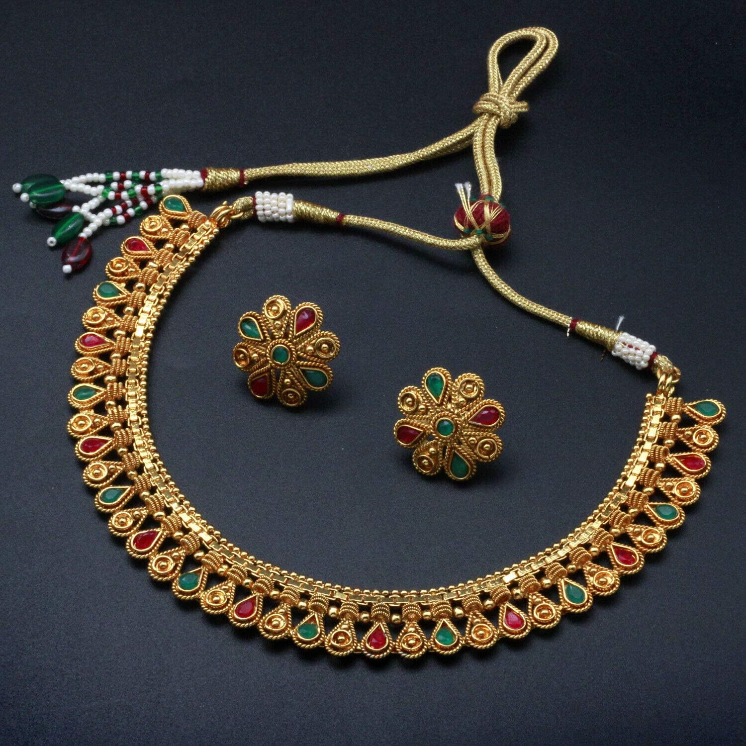 Special traditional Gold plated beautiful Polki necklace set. There is 1 piece of necklace and 1 pair earring. These set are suitable to worn all Festive occasion & season. these Item are easy to wear on silky fabric line saree and any other outfit. so please hurry up and Buy and make your moment memorable.